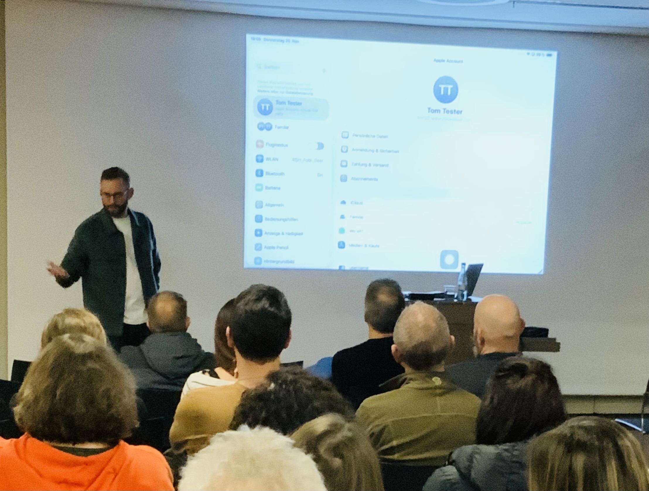 Jonas Herold erläuterte in seinem Vortrag ausführlich das Einrichten der Apple-ID und ging dabei konkret auf jede Frage von Seiten des Publikums ein. Ein weiterer wichtiger Aspekt stellte das Thema „Bildschirmzeit“ dar. Herold erklärte fachkundig, geduldig und anschaulich sämtliche Möglichkeiten der Regulierung, um die Kinder verantwortungsvoll und dosiert an die Arbeit mit dem Tablet heranzuführen, und erinnerte daran, technische Beschränkungen durch offene Kommunikation zu ergänzen.