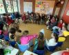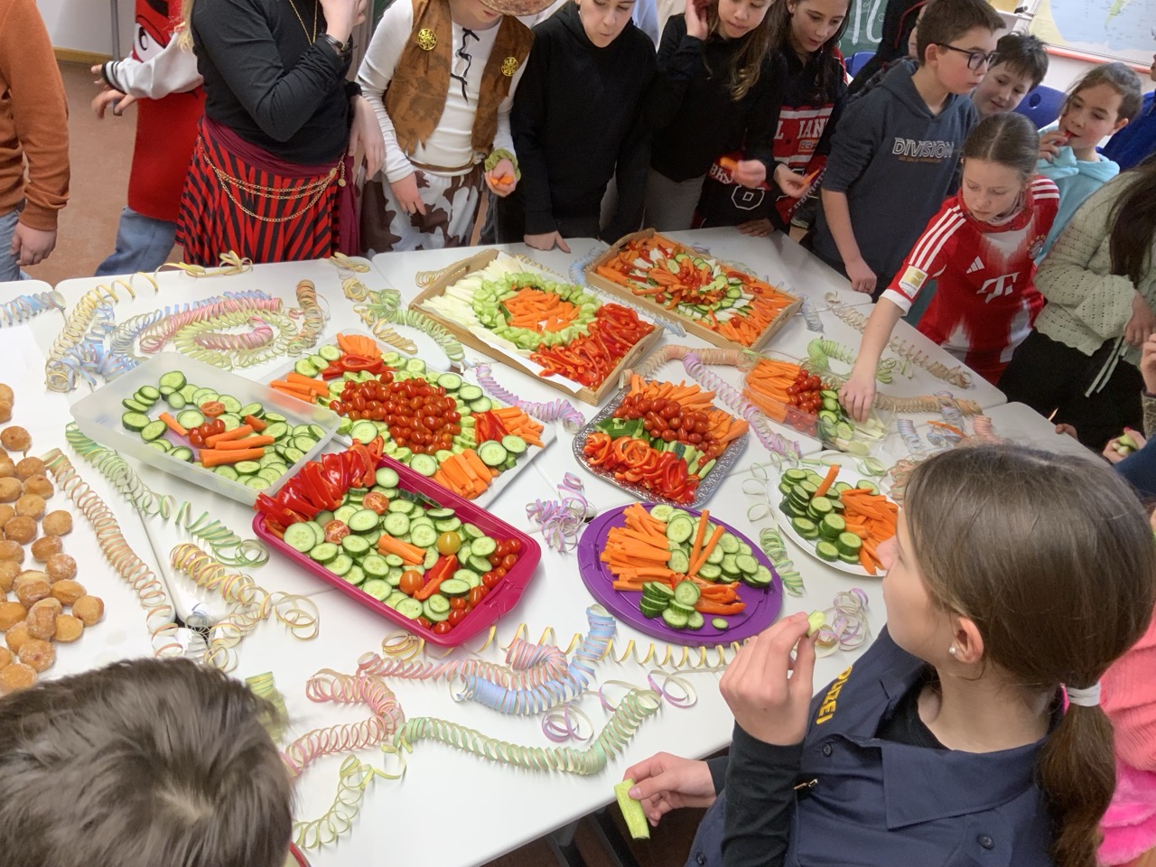 Den Höhepunkt der Feier stellte die ellenlange und lautstarke Polonaise aller sechs fünften Klassen durch und um das Schulhaus dar, die beim gesunden Faschingsbuffet einen Halt einlegte, um jedem Narren und jeder Närrin die Möglichkeit zu geben, sich zum Abschluss zu stärken. Dankenswerterweise hatten Eltern am Vormittag gespendetes Gemüse eifrig geschnitten und es gemeinsam zu einem ansprechenden Faschingsbuffet hergerichtet.