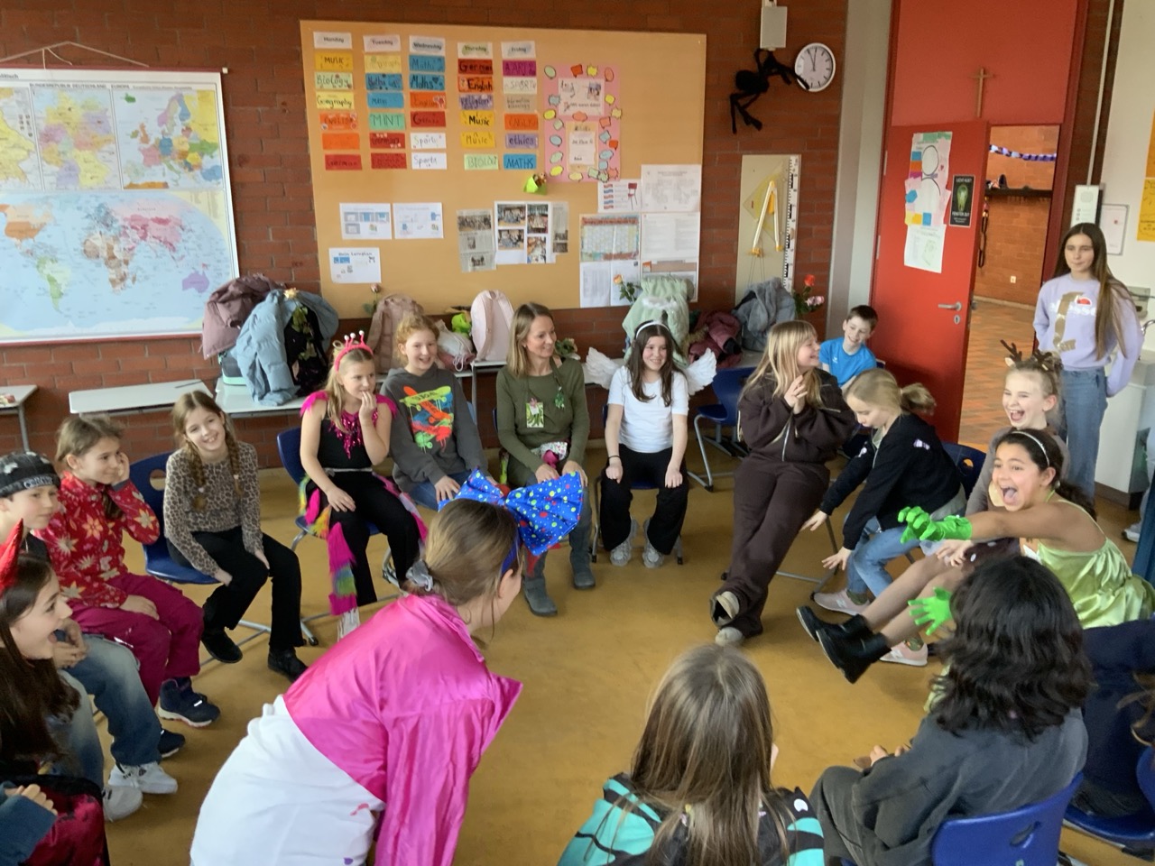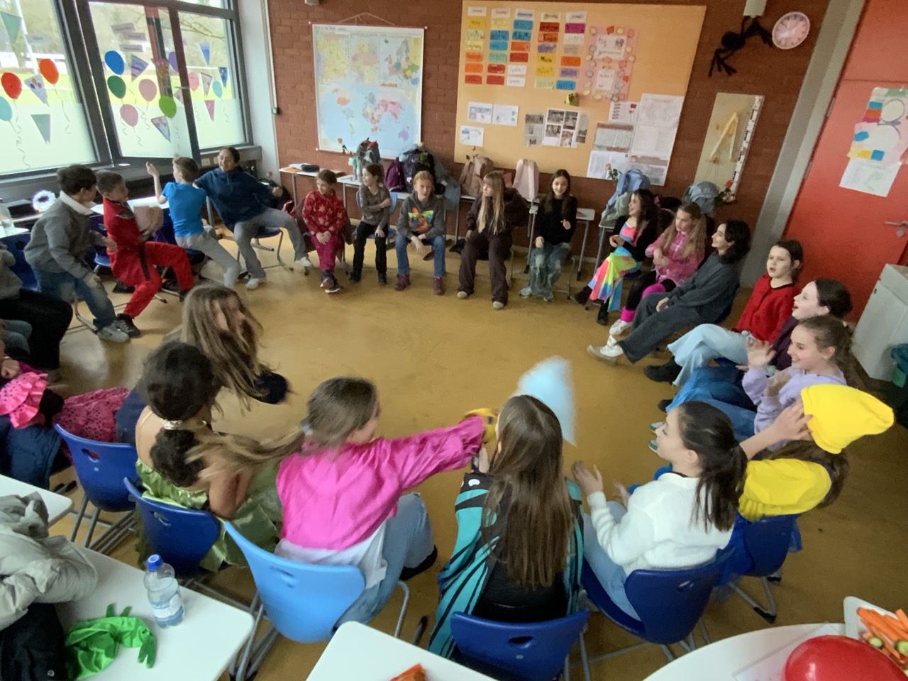 Am letzten Schultag vor den Faschingsferien verwandelte sich in der fünften und sechsten Stunde der K-Bau der RSH in einen lebhaften Faschingstrubel. Statt regulärem Unterricht stand ausnahmsweise „Helau“ auf dem Stundenplan: Die Tutoren feierten 90 Minuten lang mit ihren fünften Klassen und deren Klassenleitungen Karneval. Die Neuntklässler hatten im Vorfeld für ihre Fünftklässlerinnen und Fünftklässler Spiele vorbereitet, kleine Geschenke und Musik organisiert sowie die Räume mit Luftschlangen und Ballons geschmückt. Um gemeinsam Spaß zu haben und das Miteinander weiter zu stärken, wurden Faschingsspiele durchgeführt, Kostüme prämiert, Musik gehört, gemeinsam getanzt und vor allem viel gelacht.