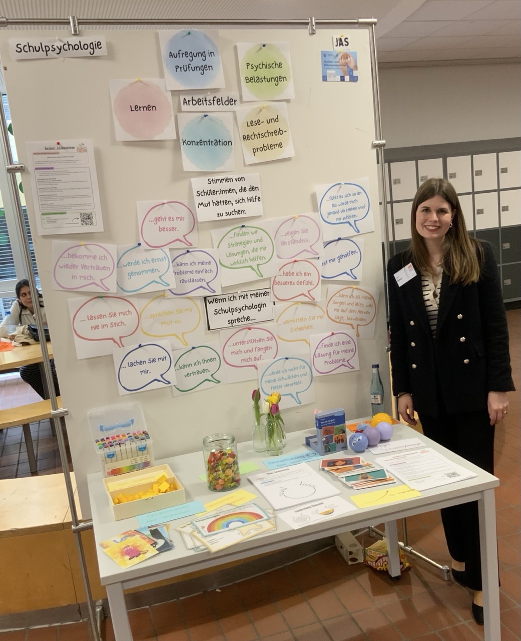 Die Schulpsychologin, der Elternbeirat und der Förderverein sowie die OGS (= Offene Ganztagsschule) präsentierten sich in der Aula als Ansprechpartner und wichtige Säulen der Schulgemeinschaft.