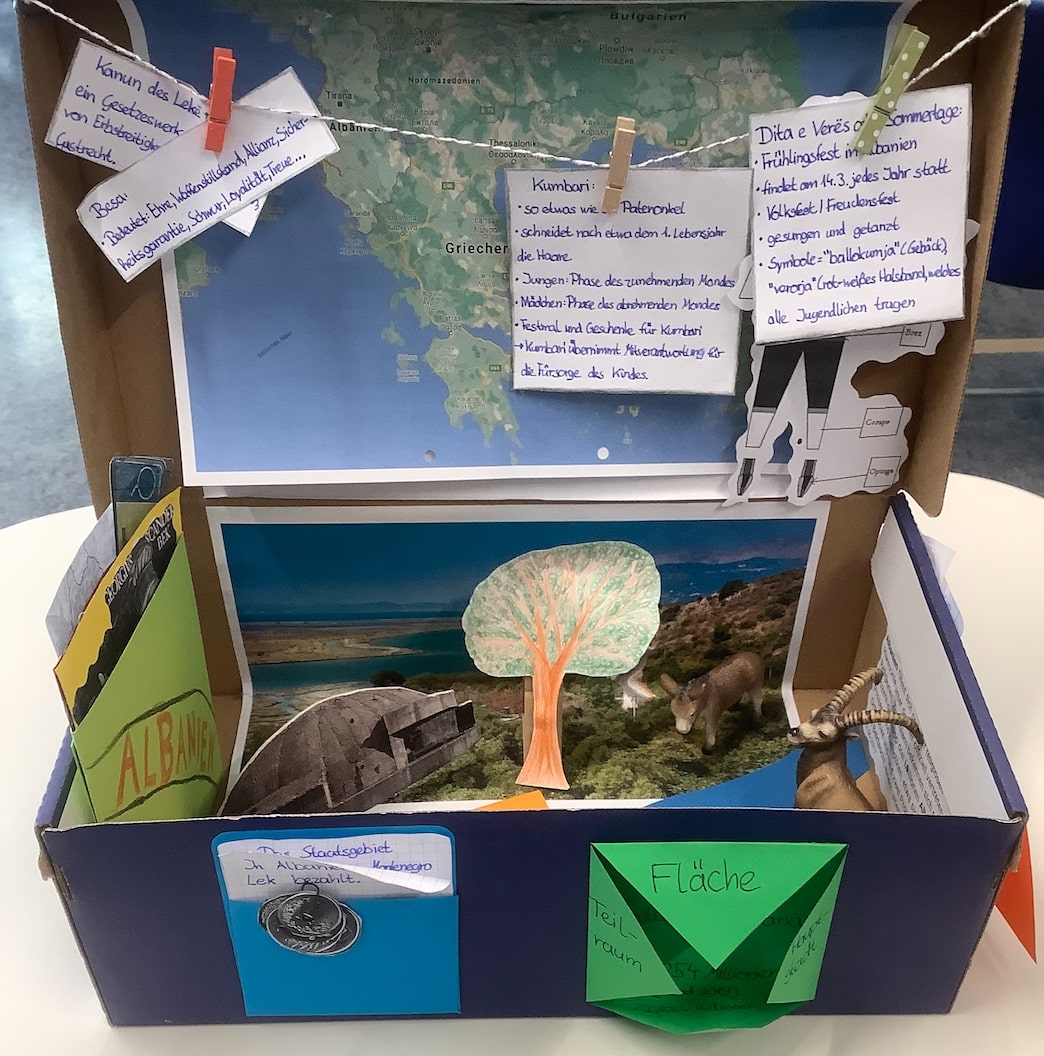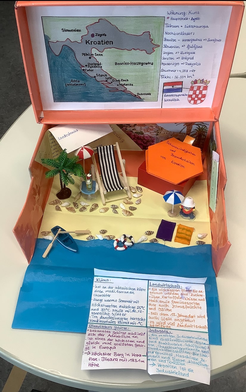 Allen Schüler*innen wurde per Losverfahren ein europäisches Land zugeteilt. Zu Beginn wurde alles Theoretische rund um den Inhalt des Schuhkartons geklärt. Dann ging es endlich mit der praktischen Umsetzung los! Kaum begonnen, tauchte sogleich die erste Schwierigkeit auf: Distanzunterricht und geschlossene Schuhläden. „Woher bekomme ich nun meinen Schuhkarton?“, fragten sich sicher einige Schüler*innen der Klasse 6c. Letztendlich wurde jedoch auch diese Komplikation von allen gemeistert. Die Schüler*innen ließen in ihren Schuhkartons kleine 3D-Welten entstehen. Vom schwedischen Fjord, über den kroatischen Strand bis hin zum polnischen Hochland waren alle Landschaftsformen vertreten. Diese wurden mit Informationstexten, Bildern, Karten und Klimadiagrammen in allen Varianten versehen. Die Elemente konnten sowohl herausgezogen als auch aufgeklappt und durchgeblättert werden. Der Kreativität wurden keinerlei Grenzen gesetzt. Sobald die Klasse wieder in der Schule war, wurden die Schuhkartons auf einer Corona-konformen Messe unter der Einhaltung der AHA-Formel präsentiert. Es war ein wirklich gelungenes Projekt!