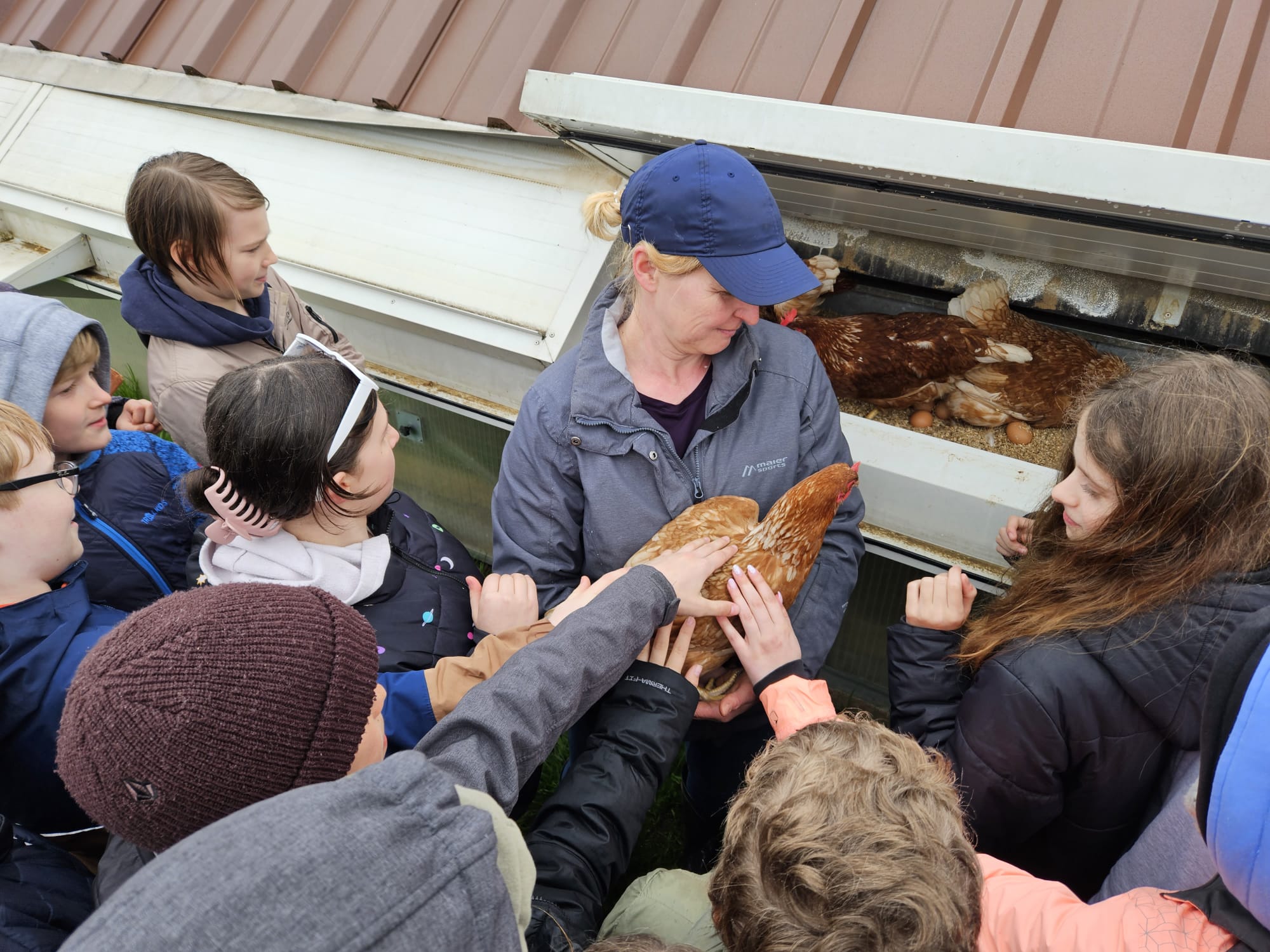Im Anschluss daran wurden wir von Frau Beck persönlich über den Hof geführt. Dabei wurden uns viele interessante Informationen über den landwirtschaftlichen Betrieb mit Schwerpunkt Mutterkuhhaltung, der ehemals ein Schäferhof mit konventioneller Tierhaltung war, vermittelt. Ebenso erhielten die Schülerinnen und Schüler einen Einblick in den Tagesablauf einer „24/7“-Landwirtin. Ein besonderes Highlight waren die Rinder, denen wir besonders nahekommen durften. Vor allem die Mutterkühe mit ihren Kälbern begeisterten die Kinder sehr, zumal sich einige bereitwillig streicheln ließen. Am Hühnerstall angekommen wurden die frisch gelegten Eier begutachtet und die beiden mobilen Ställe für ungefähr 400 Hühner in Augenschein genommen. Auch hier durfte der direkte Kontakt mit einer Legehenne nicht fehlen. Nach einem ereignisreichen Vormittag stand der Fußmarsch zurück zur Schule an. Selbstverständlich wurde die Exkursion im Anschluss ausführlich reflektiert.