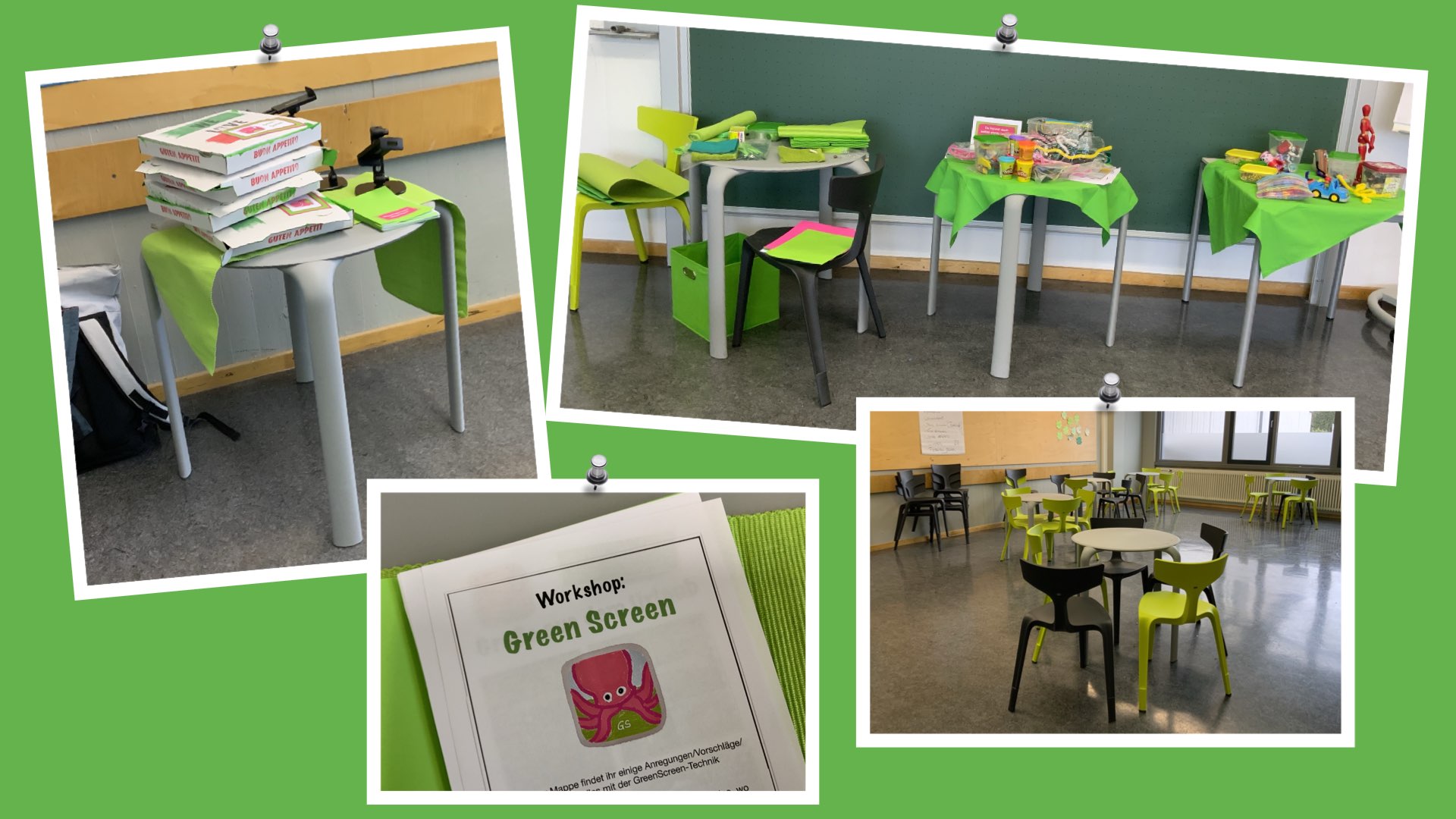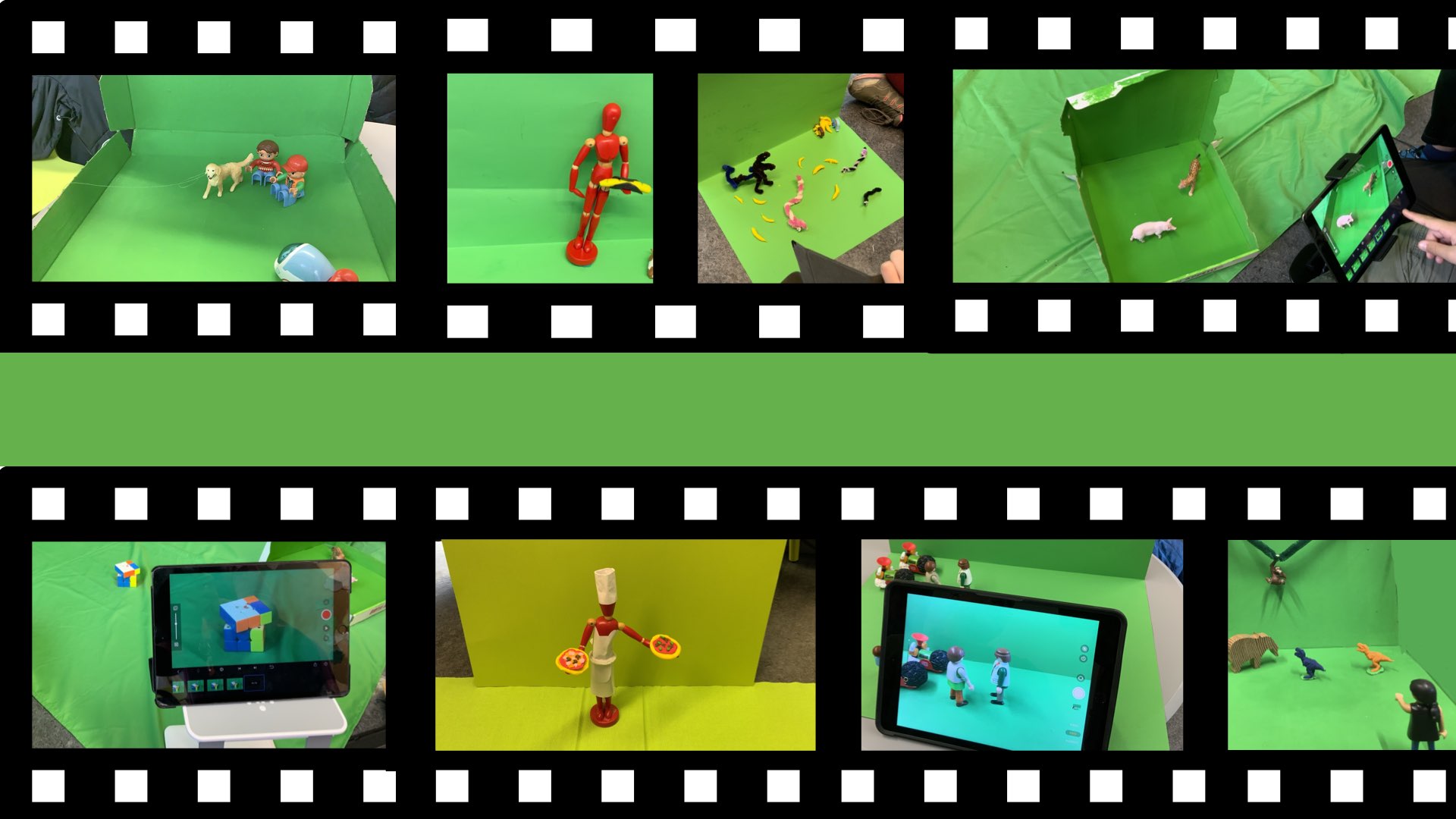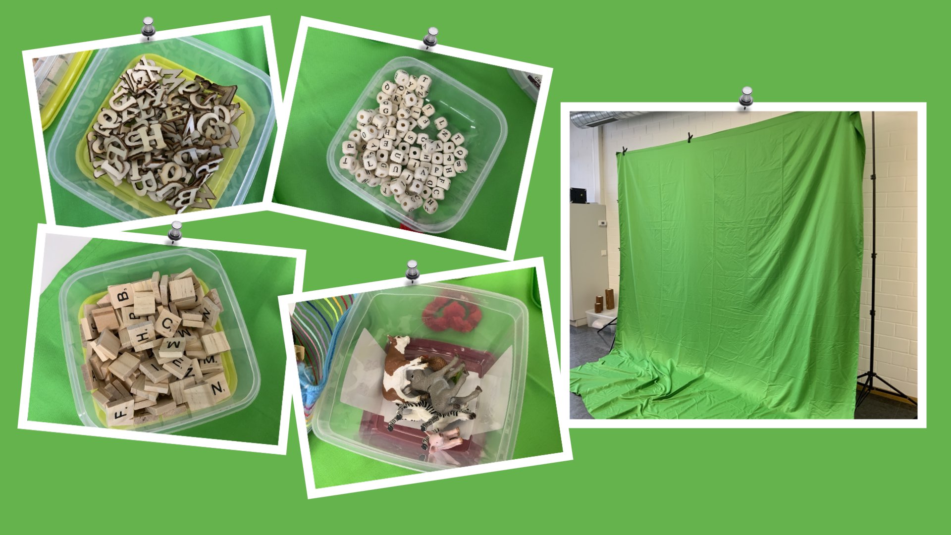 Zur Verfügung standen verschiedene grüne Flächen: angemalte Pizzakartons, Plakate, Boxen und eine große Leinwand. Mithilfe von Pfeifenputzern, Knete, Lego-, Schleich- und Playmobilfiguren sind auch kurze Stopmotion-Filme entstanden. In der verwendeten Greenscreen-App wurde der Hintergrund transparent gemacht und die Personen bzw. Gegenstände vor einen neuen Hintergrund gesetzt, z. B. vor den Eiffelturm oder auf eine gemalte Straße.