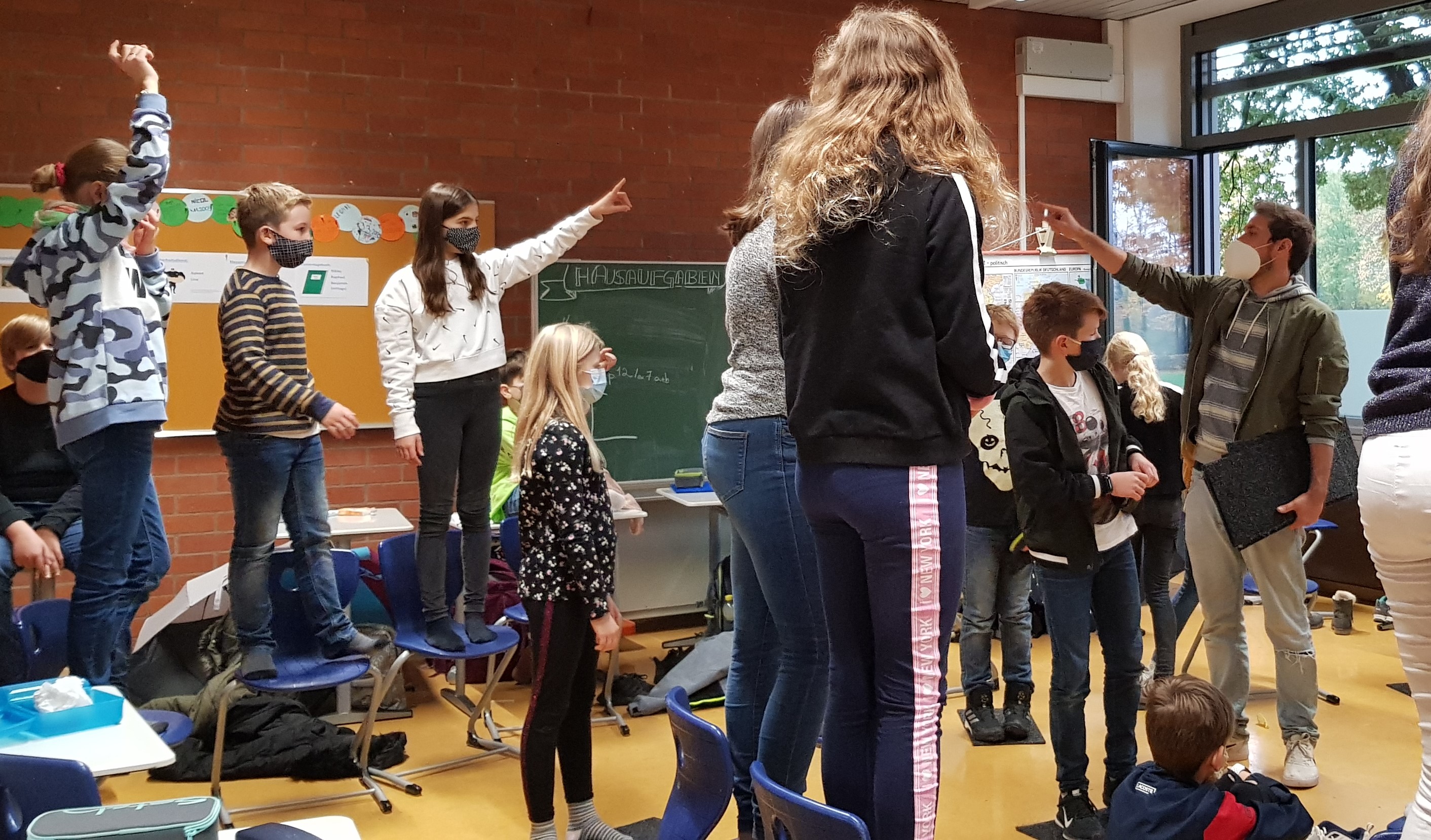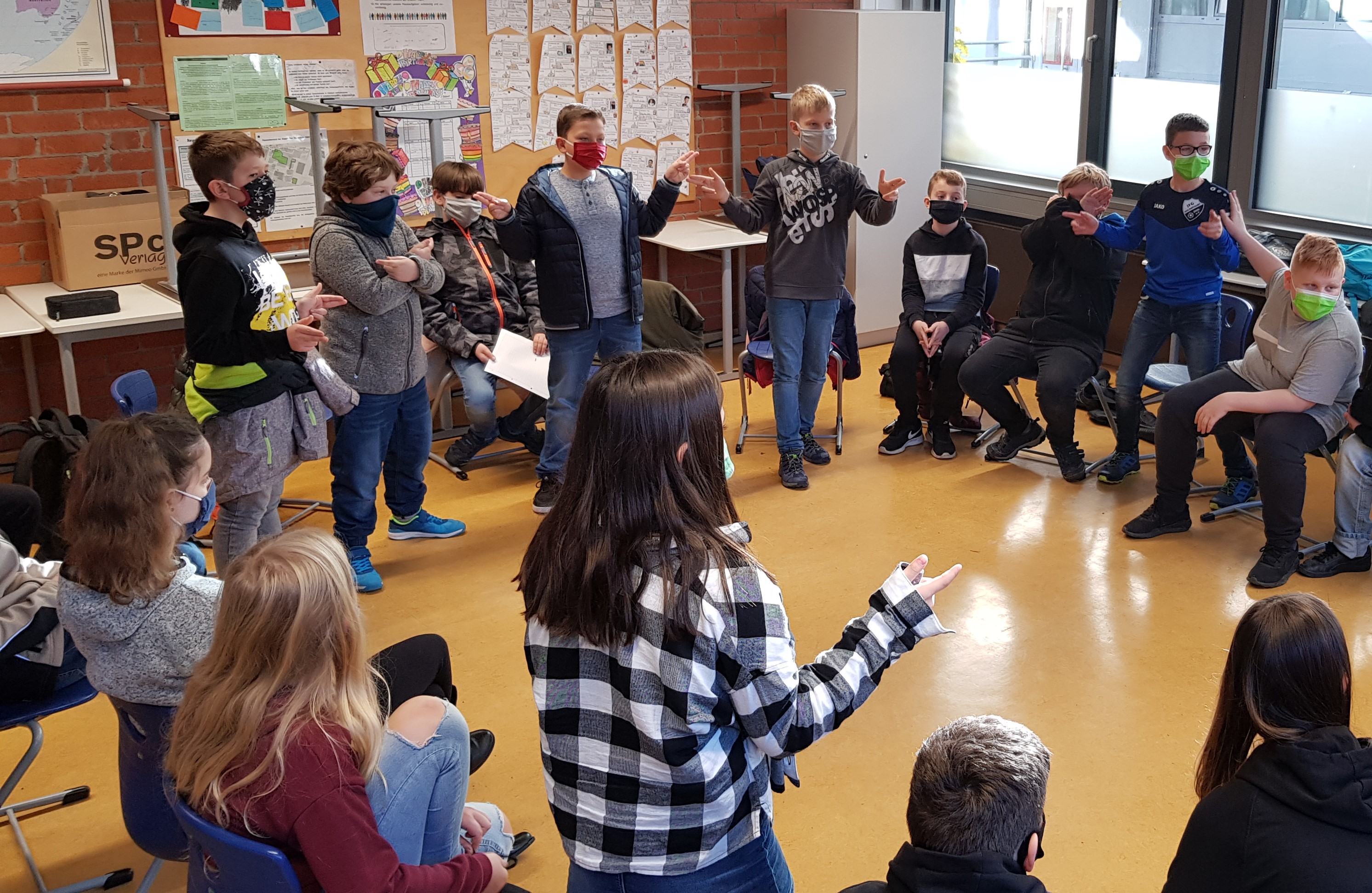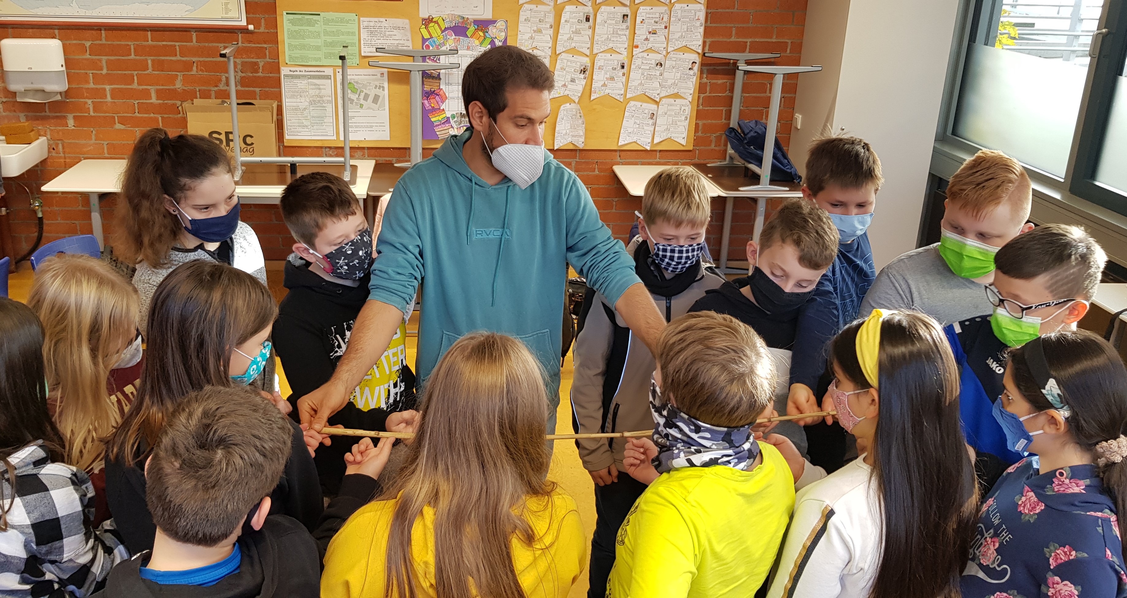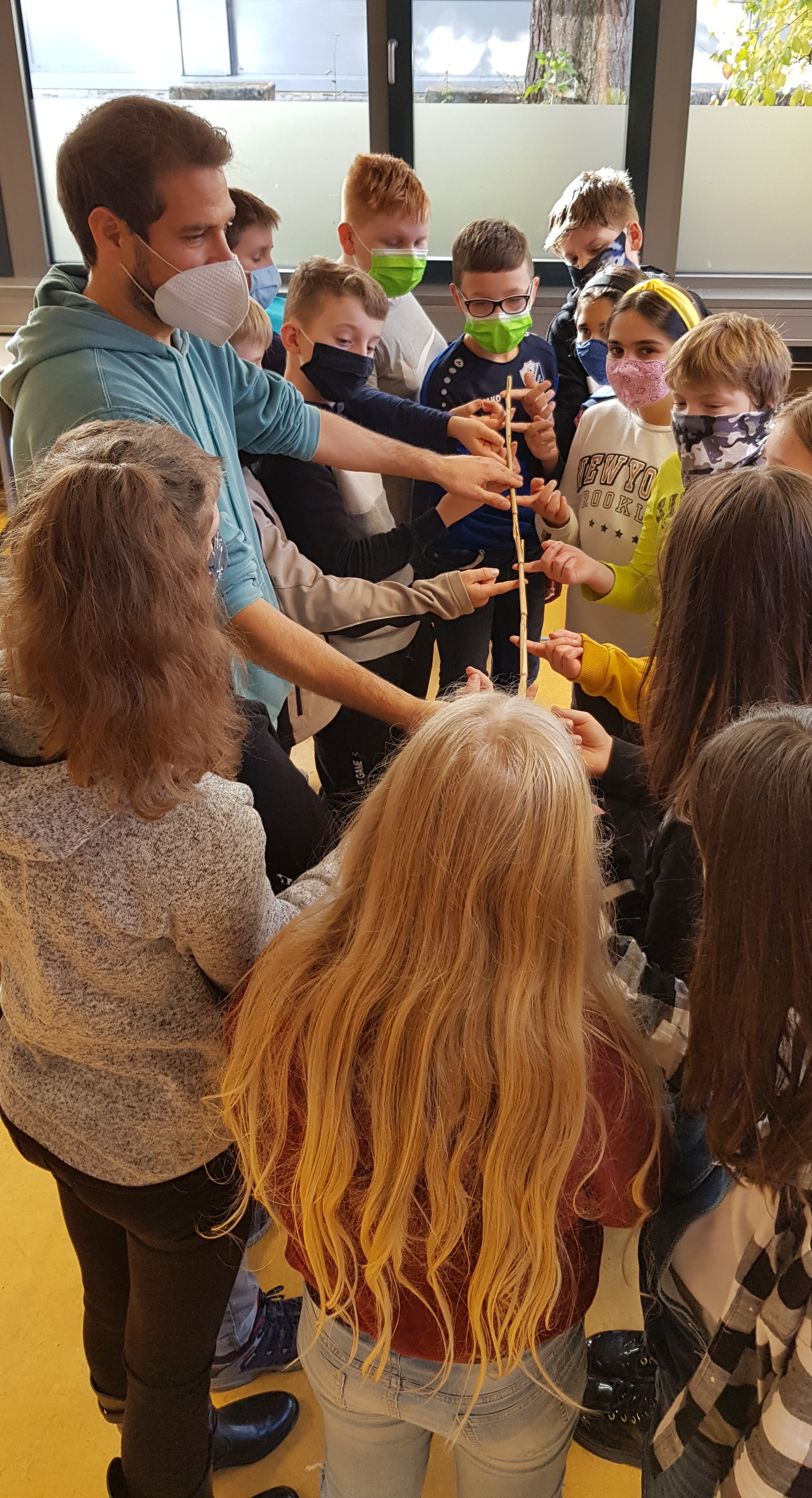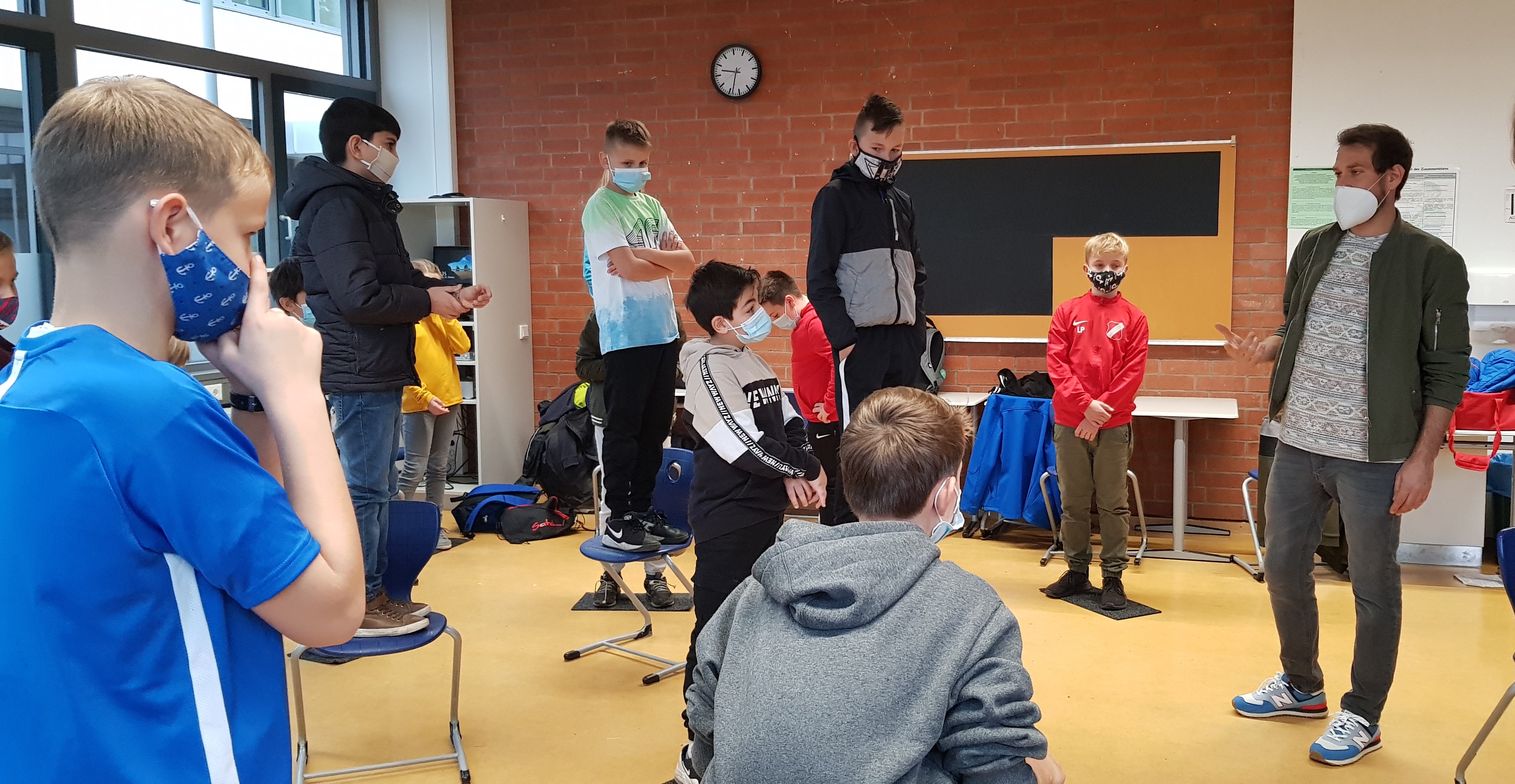 Die ersten vier Schulstunden verbrachten die Schülerinnen und Schüler mit interaktiven Kennenlernspielen, Kommunikationstraining und gruppendynamischem Teambuilding. Herr Breidbach hatte hierfür ein vielfältiges Repertoire an pädagogisch wertvollen und gewinnbringenden Aktivitäten vorbereitet. Bei der Beobachtung jeder Klassengruppe fiel positiv auf, dass die Schülerinnen und Schüler eigens auferlegte Gruppenbildungen aufbrechen konnten, sich in neuen Gruppenstrukturen formieren konnten und somit für den Außenstehenden deutlich erkennbar zu einem Team zusammenwuchsen, das gemeinsam Aufgaben zu lösen vermochte – oft auch nonverbal.