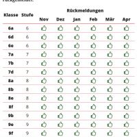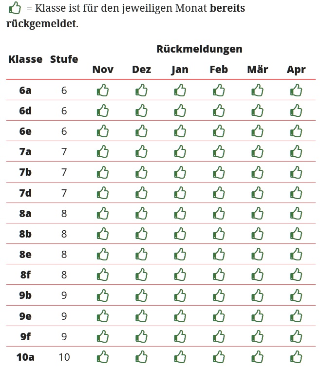 Der erhobene Daumen war schon bei den römischen Gladiatoren-Kämpfen ein willkommenes Zeichen - derjenige, dem es galt, der hatte den Kampf (und damit zugleich sein Leben) gewonnen. Heutzutage, in den sozialen Netzwerken, geht es weniger blutig zu, hier macht der gehobene oder gesenkte Daume nur eine Aussage über „finde ich gut“ oder „gefällt mir nicht“. Wie man der Abbildung entnehmen kann, haben sich vierzehn unserer Klassen gleich mehrfach den „Daumen hoch“ verdient.