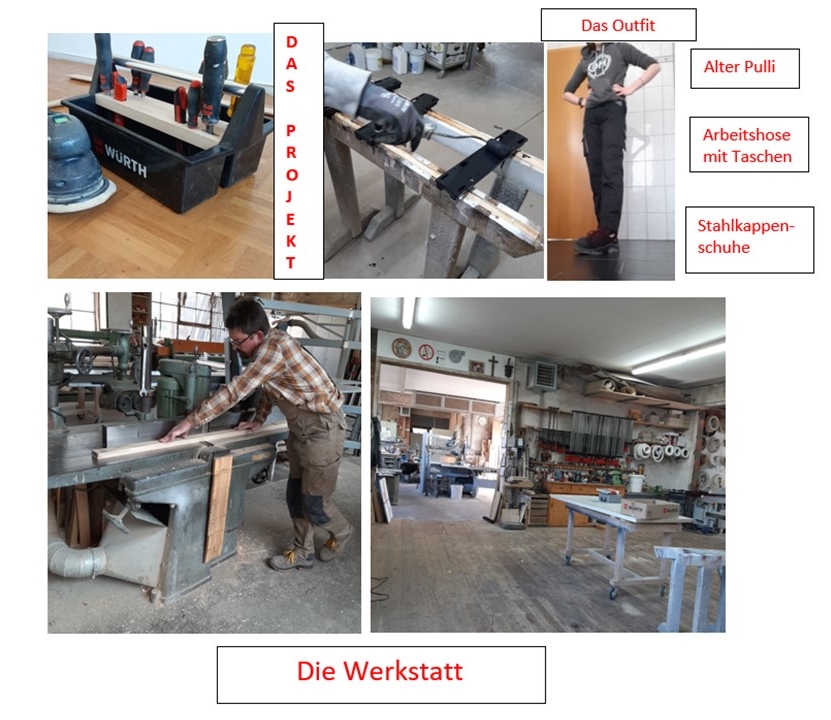 Am 28.04.2022 nahm ich am Girls‘ Day teil, der in einer Schreinerei stattfand. Um 7:15 Uhr kam ich mit Arbeitsoutfit in der Werkstatt an. Meine erste Aufgabe war eine Werkzeugkastenhalterung zu bauen, um Schraubenzieher, Cutter und andere Werkzeuge einsortieren zu können. Das verhindert das Verletzen beim Entnehmen von Werkzeugen. Danach lackierte ich diese Halterung mit schwarzer Farbe an. Im Anschluss besuchten wir einen Kunden, dessen Boden abgeschliffen werden sollte. Dort lernte ich, dass unter dem Parkett ein schwimmender Estrich (Beton) ist, der wandert. Das bedeutet, dass dieser nicht mit der Wand verbunden ist, da er sonst reißt. Nachdem wir vom Kunden zurückkehrten, war der Lack der Werkzeughalterung getrocknet und ich konnte ihn nun am Werkzeugkasten festschrauben. Der Schreinermeister hat mir im Spaß auch zwei Schreinerregeln beigebracht: