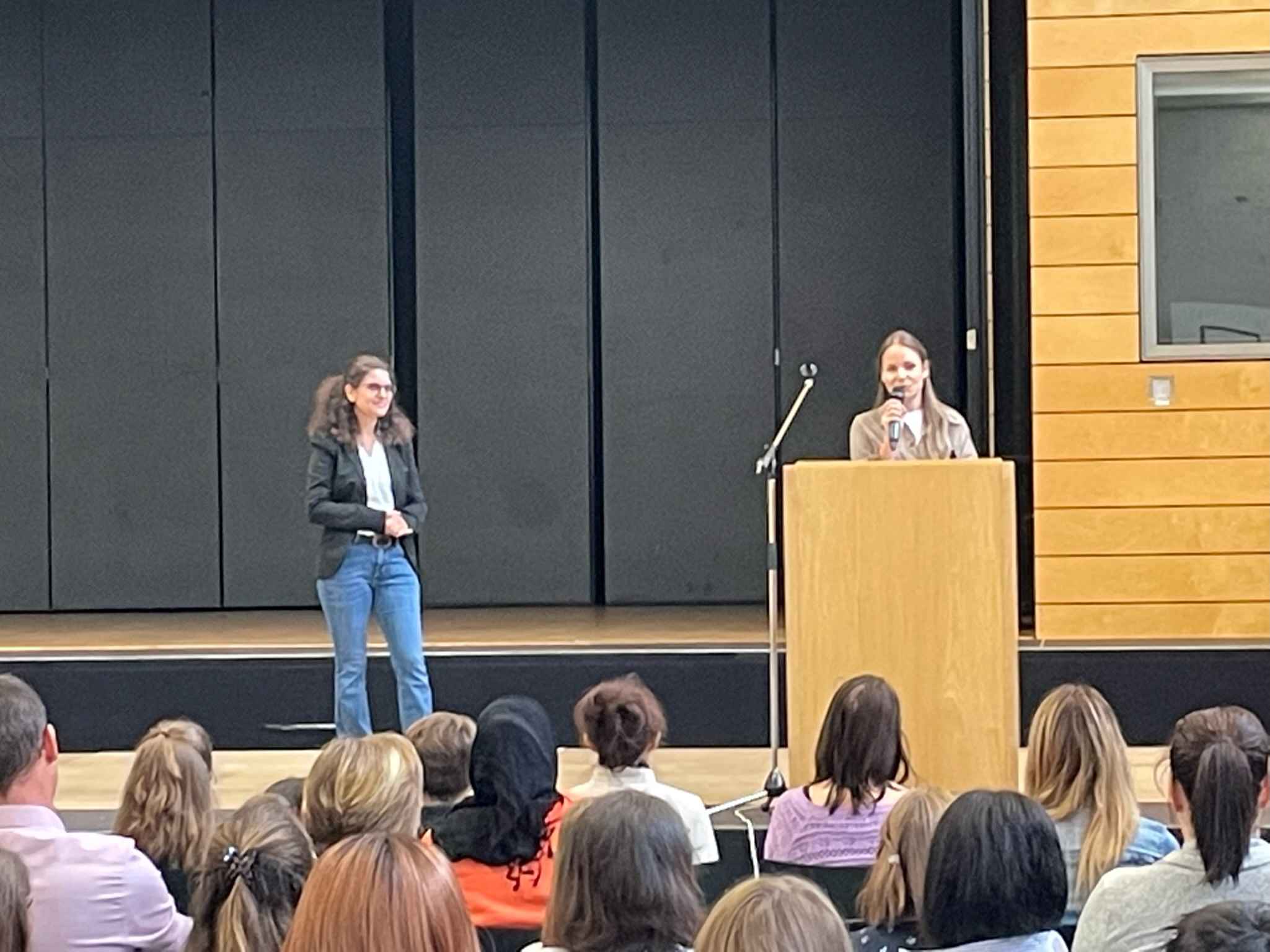 Anschließend stellte sich unsere neue Jugendsozialarbeiterin, Frau Judith Richter, dem Publikum vor. Sie erinnerte die Eltern an deren Schulzeit und an Momente, bei denen Ansprechpartner für kleinere und größere Sorgen in der Schule wichtig waren. Frau Richter wird zukünftig als Ansprechpartnerin für unsere SchülerInnen fungieren, die sich vertrauensvoll bei schulischen aber auch privaten Sorgen an sie richten können. Ein offenes Ohr wird sie auch für die Eltern haben, falls eine Beratung gewünscht wird.