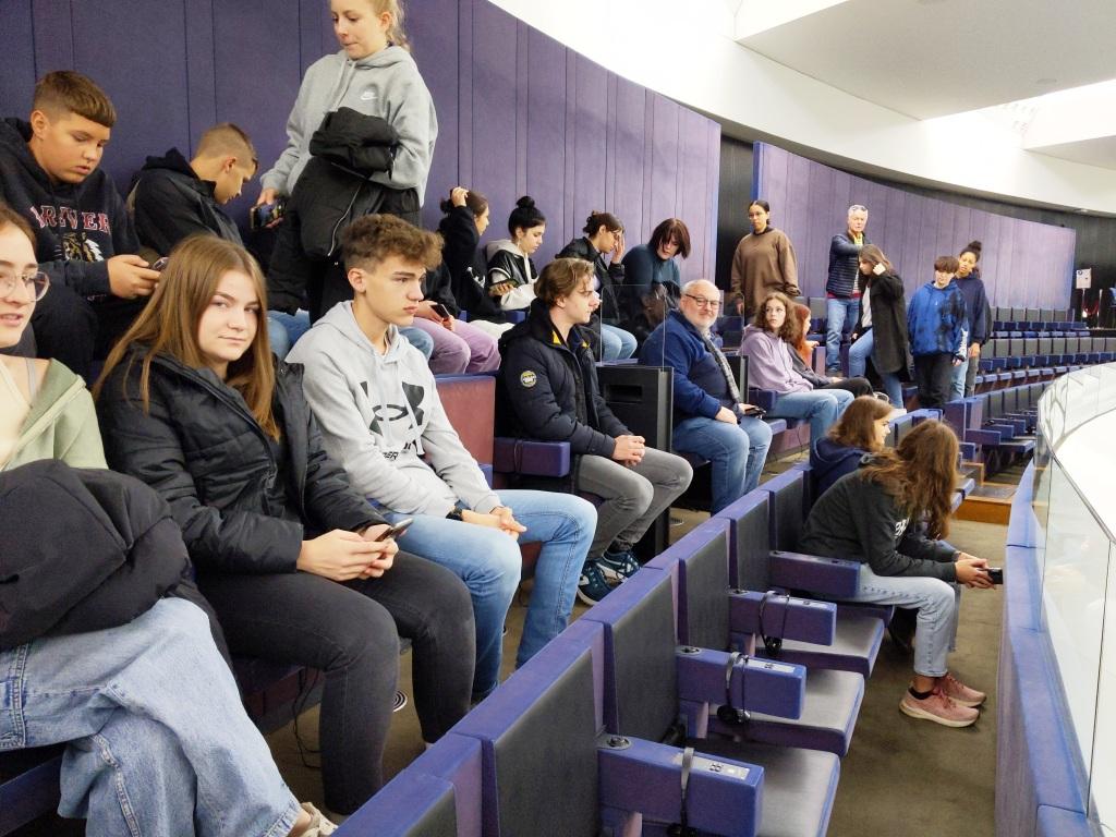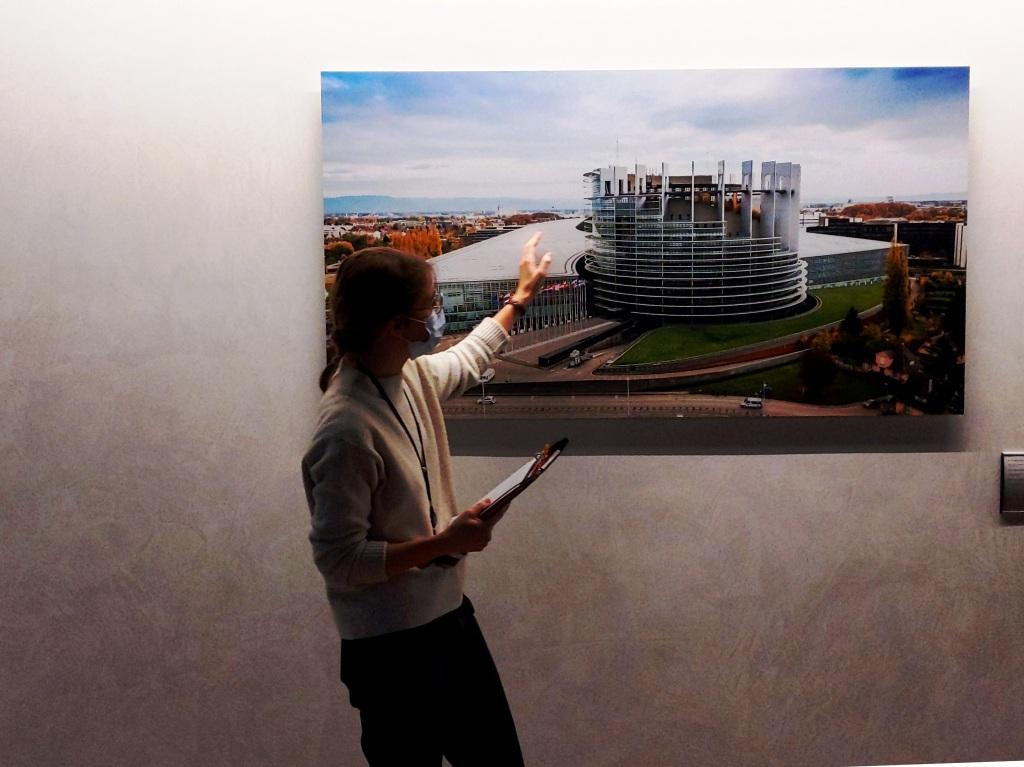Unseren heutigen Reiseführer, Herrn Peter, haben wir im Bus getroffen. Er lotste unseren Fahrer Jusuf dann nach Straßburg und zum Europaparlament. Unterwegs hat er uns viel erklärt, beispielsweise die Universität und andere Gebäude, die unter Kaiser Wilhelm gebaut wurden, als Straßburg wieder mal zu Deutschland gehörte. Kurz vor 10 Uhr kamen wir dann am Europaparlament an. Als erstes mussten wir durch die Sicherheitskontrolle, dies lief ähnlich wie beim Flughafen ab, das heißt kein Essen und kein Trinken waren dort erlaubt. Danach machten wir kurz Bilder und wurden direkt von unserer Führerin Claire empfangen, die uns das Europaparlament zeigte (Bild 7). Es war sehr interessant ihr zuzuhören. Wir gingen als erstes zu den Flaggen der gesamten EU-Mitglieder und machten dort ein Gruppenbild (Bild 8). Danach nutzten wir die Rolltreppen und fuhren ganz hoch und besichtigten das Plenum, was wirklich sehr schön anzuschauen war. Dort bekamen wir allgemeine Fakten erzählt, über die Parteien und die Dolmetscher, die mindestens drei verschiedene Sprachen übersetzen müssen (Bilder 9 und 10). Anschließend hatten wir 10 min Zeit und durften uns umschauen, dann schauten wir einen kurzen Film. Nun erklärte uns unser Stadtführer noch einige Sachen anhand einer Weltkugel. Insgesamt war es sehr Interessant und ist auf jeden Fall einen Besuch wert.