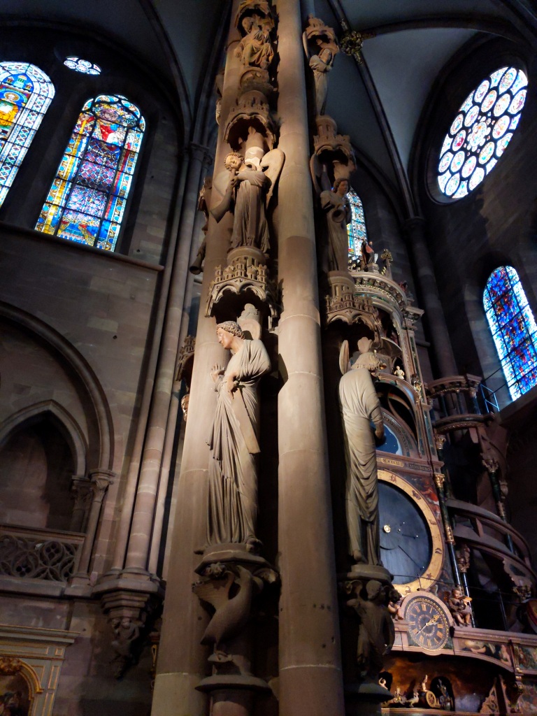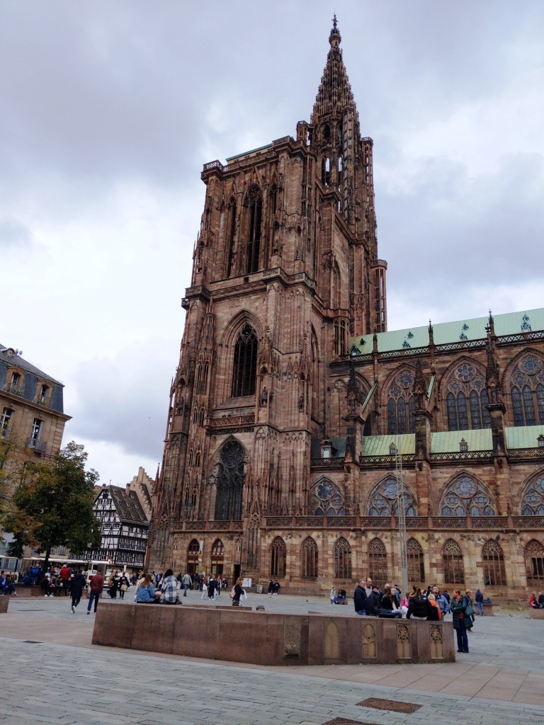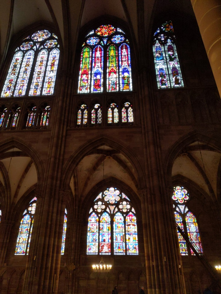 Anschließend brachte uns Jusuf an den Rand der Straßburger Innenstadt, in die der Bus nicht hinein durfte. Unser Stadtführer Herr Peter brachte uns dann zu einem kleinen Platz in der Nähe des früheren Bischofspalastes, wo wir erst einmal ein kleines Picknick gemacht haben. Anschließend haben wir die Straßburger Kathedrale besucht. Zuerst sind wir (lange) um die Kathedrale gelaufen, wobei uns Herr Peter viel über dem Dom erzählt hat, auch wenn nicht alle zu gehört haben. Wir haben zum Beispiel erfahren, dass der Turm ungefähr 140 Meter hoch ist (Bild 11). Ursprünglich wollten die Bischöfe auch noch einen zweiten Turm bauen lassen, jedoch hat sich die Bevölkerung aus kostentechnischen Gründen dagegen entschieden. Schließlich sah es das Volk nicht ein, für die Wünsche anderer zu bezahlen. Man kann ja auch verstehen, dass sie nicht für den Tod und die Verletzungen verantwortlich sein wollten, wenn Bauarbeiter vielleicht beim Bau der Kathedrale abgestürzt sind. Herr Peter hat uns so sehr mit Infos überschwemmt, dass wir nach und nach den roten Faden verloren haben. Eine Sache ist aber noch hängen geblieben, und zwar die Gravuren der Steinmetze vor der Kathedrale. Danach sind wir dann auch endlich mal rein gegangen. Innen waren die meisten von uns damit beschäftigt Fotos zu machen, so dass wir nicht viel von Herrn Peters Erzählungen mitbekommen haben. Die Fenster und der Innenraum sind wirklich beeindruckend (Bilder 12, 13). Unser Interesse hatte Herr Peter, als er uns ein Gitter, durch das man unzählige am Boden liegende Münzen sehen konnte, zeigte. Mehr ist eigentlich nicht wirklich hängen geblieben. Unser Fazit: An sich hat sich Herr Peter sehr viel Mühe gegeben, aber es war etwas zu viel an Informationen.