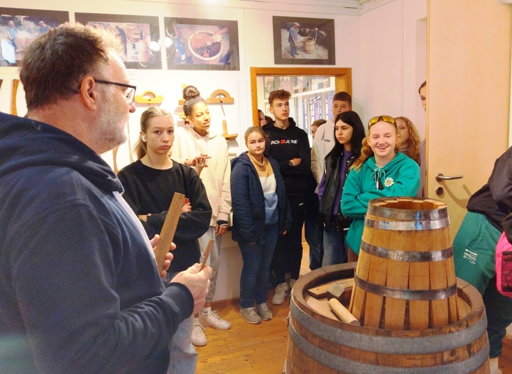 Am letzten Tag unserer Abschlussfahrt haben wir erst einmal gefrühstückt und dann die Zimmer geräumt. Gegen 10 Uhr ging es dann zum Handwerksmuseum Kehl-Kork. Es ist in einem ehemaligen Brauereigebäude untergebracht. Gezeigt werden alte ausgestorbene oder veränderte Handwerksberufe; dazu Modell-Darstellungen der für die Region typischen Fachwerkhäuser. Zusammen mit dem Leiter des Museums haben wir uns unter anderem die Berufe des Schuhmachers, Uhrmachers, Zimmermanns, Wagners, Küfers (Bild16), Steinmetzes, Schmiedes und des Sattlers angeschaut und erläutert bekommen.
