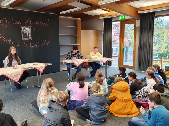 Am Donnerstag, den 18.11.2022 fand im Rahmen des Bundesweiten Vorlesetages – der in diesem Jahr unter dem Motto „Gemeinsam einzigartig" stand - für unsere sechs fünften Klassen im benachbarten Bibliothekszentrum eine Vorleseaktion statt. Jede Klasse machte es sich für eine Unterrichtsstunde mit ihrer Lehrkraft in einem abgeteilten Bereich im Obergeschoss der Bücherei gemütlich, um Auszügen aus dem Buch „Brummps – Sie nannten ihn Ameise“ aufmerksam zu folgen.