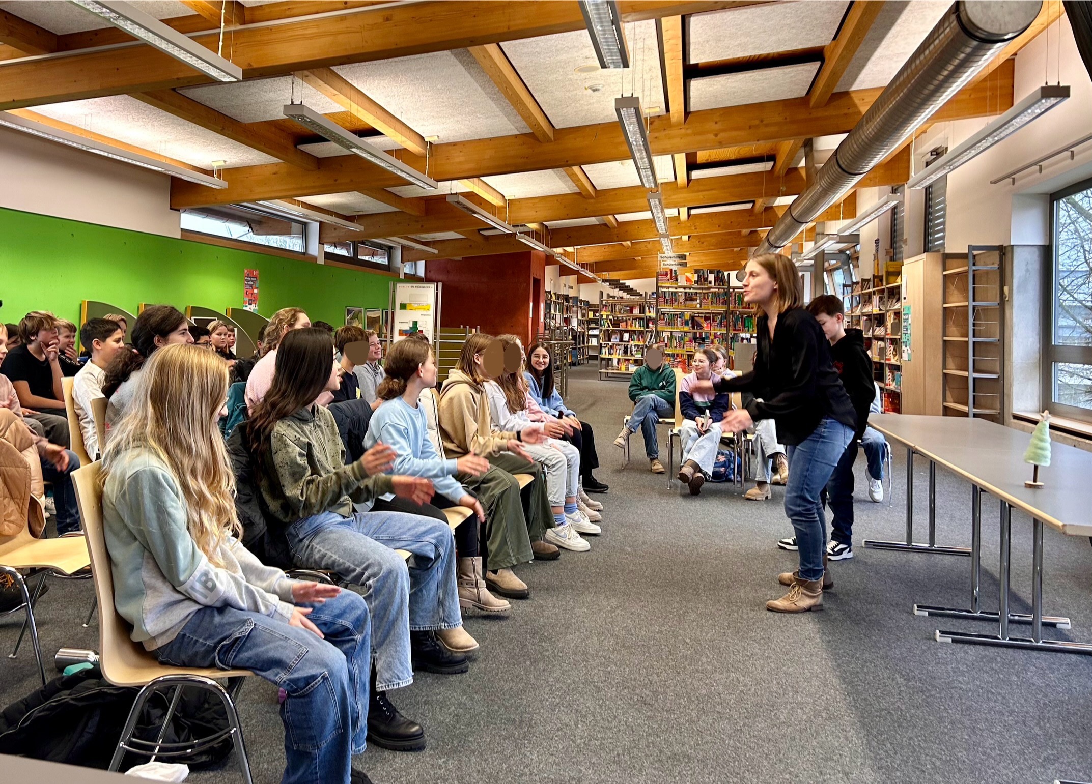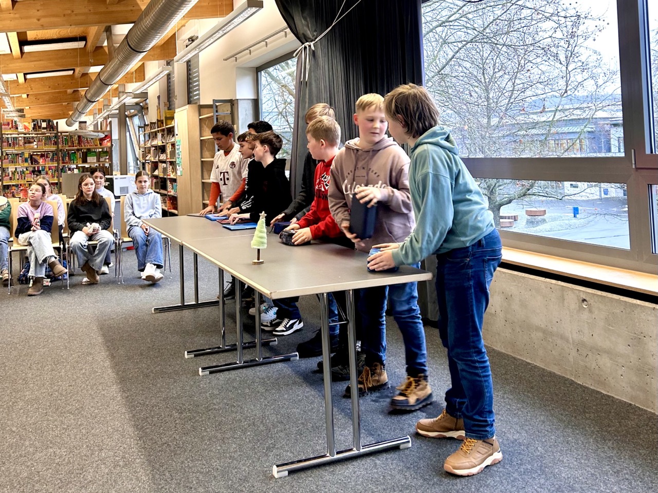 Bewertet wurden sie von einer Jury aus Herr Maisa, dem Bibliotheksleiter in Hösbach, der Schulleiterin Frau Zlotos, Frau Diergardt-Schulz und den beiden Schülersprecherinnen Sarah Placke und Jana Hock. Sie achteten auf flüssiges Vorlesen, aber auch auf das Lesetempo und die Betonung. Frau Hentschel führte die Jury und die Publikumsklassen 6e und 6f durch die Veranstaltung. Zwischendurch konnte die Klasse 6e mit musikalischen Einlagen unter der Leitung von Frau Papsdorf begeistern. Sie musizierten mit Alltagsgegenständen aus der Schule, wie mit dem Stuhl, dem Mäppchen, Stiften und so weiter.