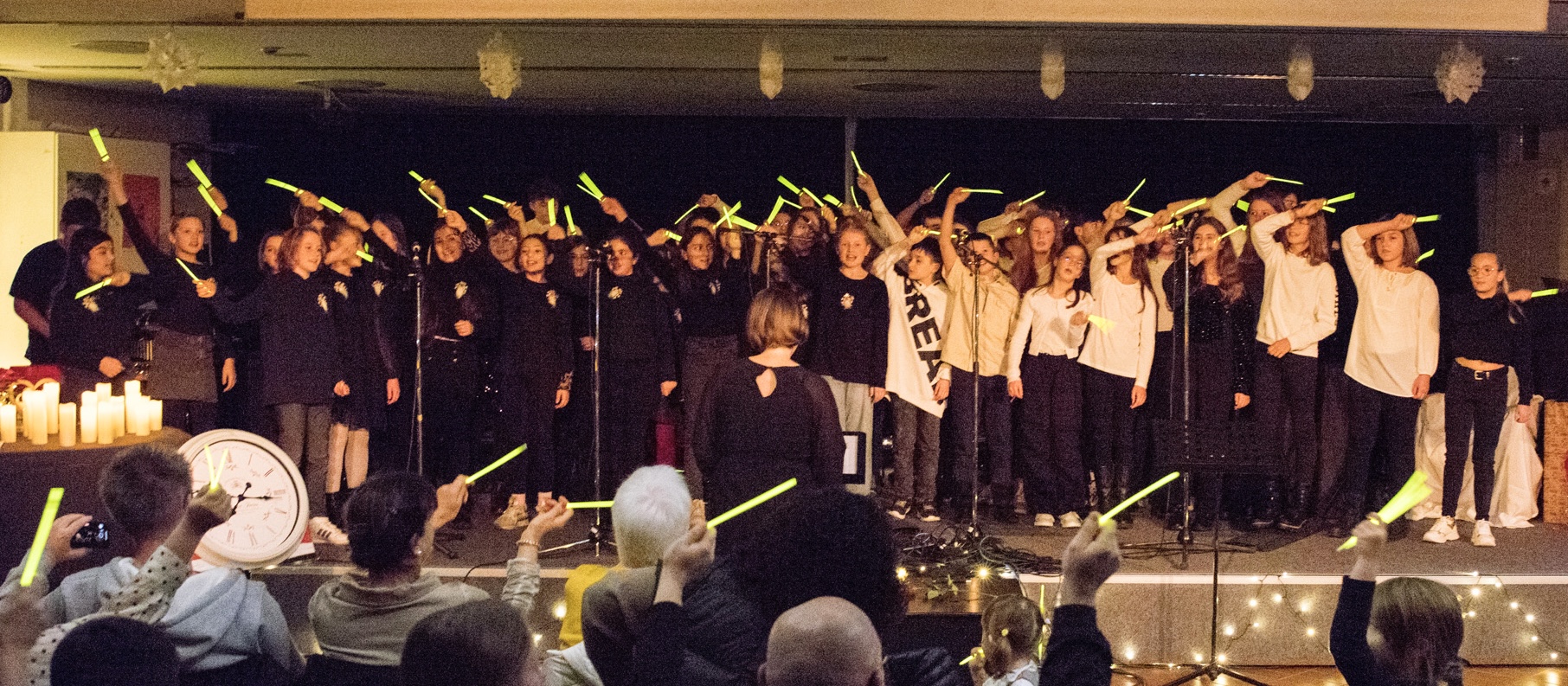 Ein weiteres Highlight war der folgende Programmpunkt: Nele Scheuner, die Gewinnerin des Vorlesewettbewerbs der RSH, vermittelte mit angenehmer und sicherer Stimme dem Publikum aus der Perspektive einer Kerze die Botschaft, dass die Dunkelheit mit einer einzelnen Kerze überwunden werden kann und dass ein kleines Licht, das symbolisch für Liebe und Menschlichkeit steht, wenn es weitergegeben wird, in immer mehr Herzen Freude und Hoffnung pflanzt. Dieses Licht wurde mit dem Publikum „geteilt“. Jeder der Anwesenden bekam ein Licht überreicht, das im gemeinsamen Lied aller Musizierenden in einer Choreographie Anwendung fand und die Aula mit „Millionen Lichter“ und allen Stimmen und Instrumenten wortwörtlich erhellte. Mit dem Licht und Freude im Herzen, tollen Liedern im Ohr verabschiedete der Lehrerchor mit einem wunderschön vorgetragenen irischen Segenslied das Publikum. Alle Musizierenden freuen sich auf ein Wiedersehen beim nächsten Schulkonzert der Staatlichen Realschule Hösbach.