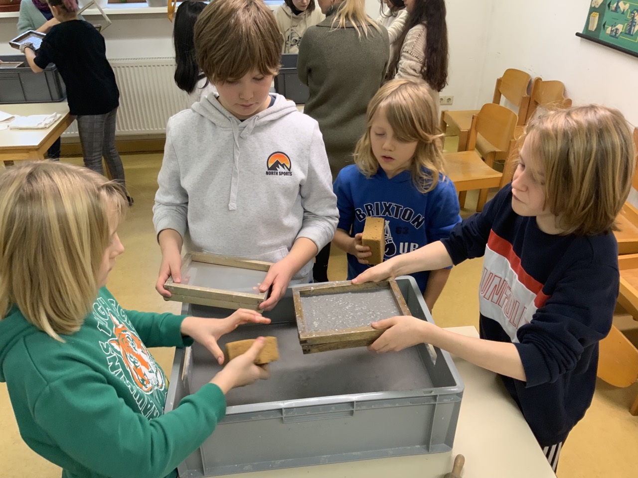 Jede Klasse nahm an drei unterschiedlichen Modulen teil, die vom gesamten Team des Schullandheims Hobbach organisiert und angeleitet wurden. Hierbei standen Umweltthemen, die die Schülerinnen und Schüler für den Naturschutz sensibilisieren und aufklären sollten, an den drei Tagen auf dem Programm: Altersgerecht, erfrischend und mit besonders viel Herzblut wurden den Kindern die Themen “Insekten”, “Papierschule” oder “Klimafabrik Wald” vermittelt. Hierbei durften die Fünftklässler und Fünftklässlerinnen z.B. die ca. 20 cm große Stabheuschrecke nicht nur bewundern, sondern das drahtige Tier auch auf sich herumkrabbeln lassen. In der Papierschule hatten die Kinder die Aufgabe, selbst Pulpe herzustellen, die Masse zu schöpfen, zu wiegeln, abzugautschen und anschließend ihren Papierbogen mit weiteren Naturprodukten oder Farben zu gestalten. Bei den einzelnen Arbeitsschritten war besonders viel Teamwork sowie Geduld gefordert. Die Ergebnisse konnten sich sehen lassen und wurden sicherlich bei dem einen oder anderen Familienmitglied als Geschenk unter dem Christbaum gefunden.