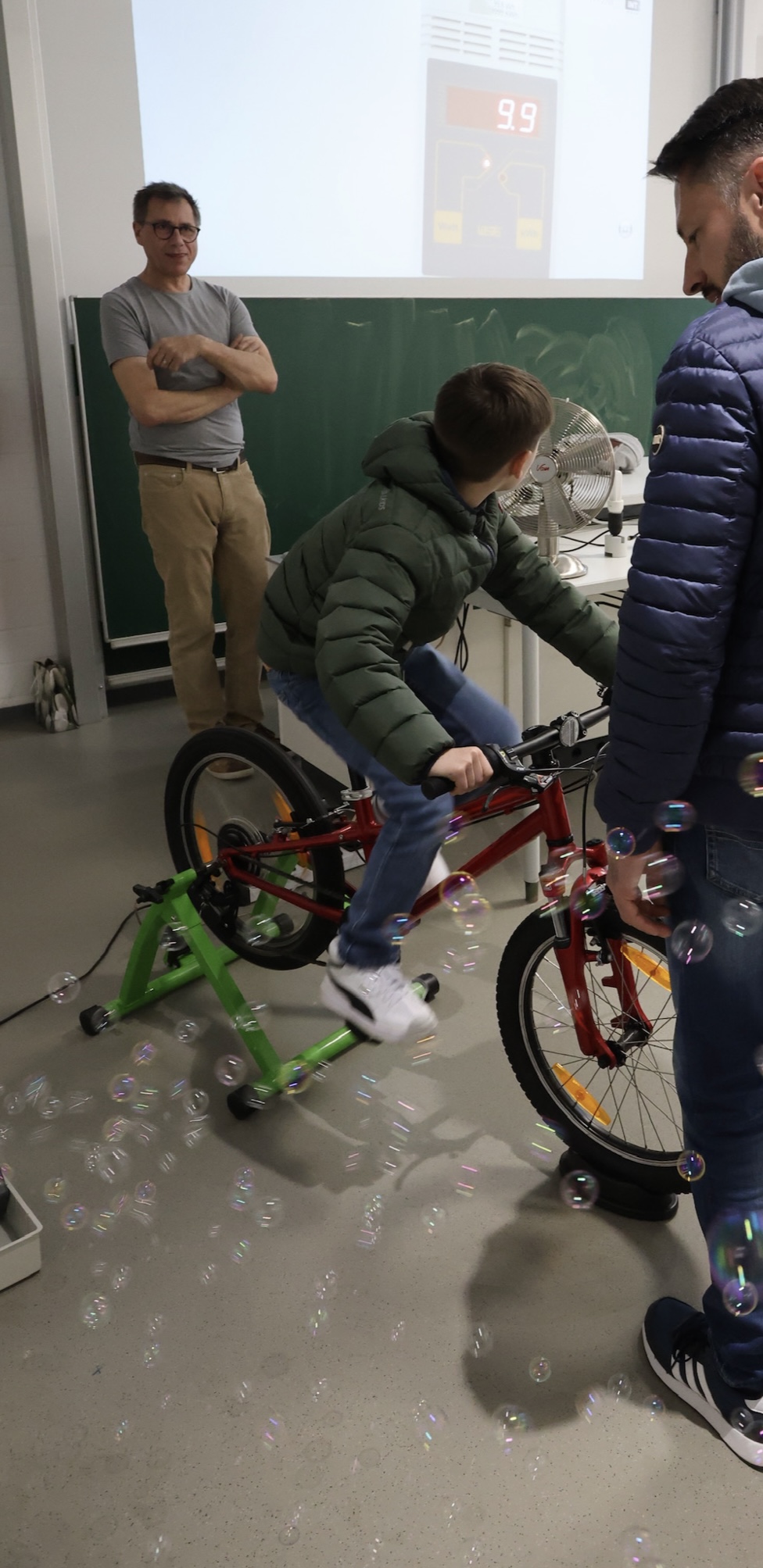 Mit viel Herzblut und Engagement hatten die Fachschaften ihre Räume mit Unterrichtsbeispielen aus dem Schulalltag und abwechslungsreichen Mitmachaktionen bereichert, sodass die neugierigen Kinder Eindrücke ihrer zukünftigen Unterrichtsfächer an der RSH sammeln konnten. Egal ob auf Papier, am Tablet, mit Hilfe von Büchern, mit Kostümen, durch das Mikroskop oder bei naturwissenschaftlichen Versuchen – es konnte viel entdeckt und experimentiert werden. Im Bereich Physik konnten die Besucherinnen und Besucher unter anderem mit Hilfe eines „Energiefahrrads“ elektrische Energie erzeugen um z. B. einen Ventilator, eine LED oder eine Seifenblasenmaschine zu betreiben. Das Landratsamt Aschaffenburg stellte der Schule das „Energiefahrrad“ zur Verfügung und unterstützte die Fachschaft Physik in Person von Herrn Hoos an diesem Tag der offenen Tür.