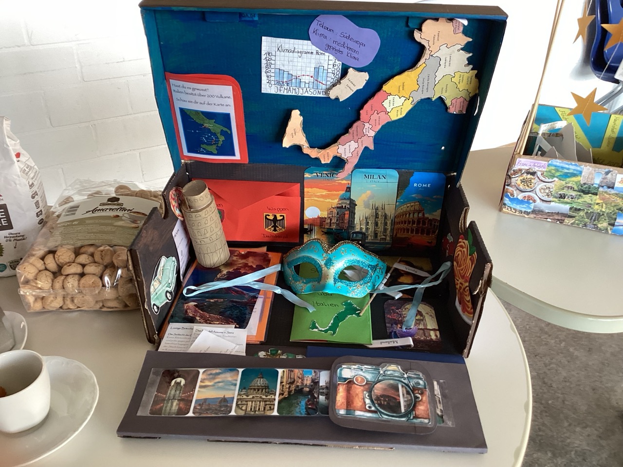 Der Kontinent Europa begleitet die Schülerinnen und Schüler der 6. Jahrgangsstufe das gesamte Schuljahr. Ein Schwerpunkt war die Gestaltung eines Schuhkartons, der ein europäisches Land repräsentiert. Dabei konnte jeder Lernbereich, der im Laufe des Schuljahres behandelt wird, in den Schuhkarton eingebracht werden. Die Schülerinnen und Schüler bezogen die Themen Landwirtschaft, Industrie, Verkehr und den Tourismus im jeweiligen Land mit ein und boten einen umfassenden Einblick in auch weniger bekannte Länder. Per Losverfahren wurde jedem Kind der Klasse 6c ein Land zugeteilt. Mit Hilfe der Inhalte aus dem Unterricht und des Einbezugs digitaler Medien gelang es den Schülerinnen und Schülern, vielfältige geographische Informationen zu integrieren. Durch Klappelemente, informative Karteikarten, Klimadiagramme, originale Gegenstände sowie Kartenmaterial wurden die kleinen Welten zum Leben erweckt. Die Vorstellung der Schuhkartons fand im Rahmen eines „Marktplatzes“ statt. Die Schülerinnen und Schüler konnten so ihr Wissen weitergeben und auch Feedback zur Gestaltung und Präsentation erhalten. Eine Ausstellung am Tag der offenen Tür am 08.03.2024 rundete das sehr gelungene Projekt ab.