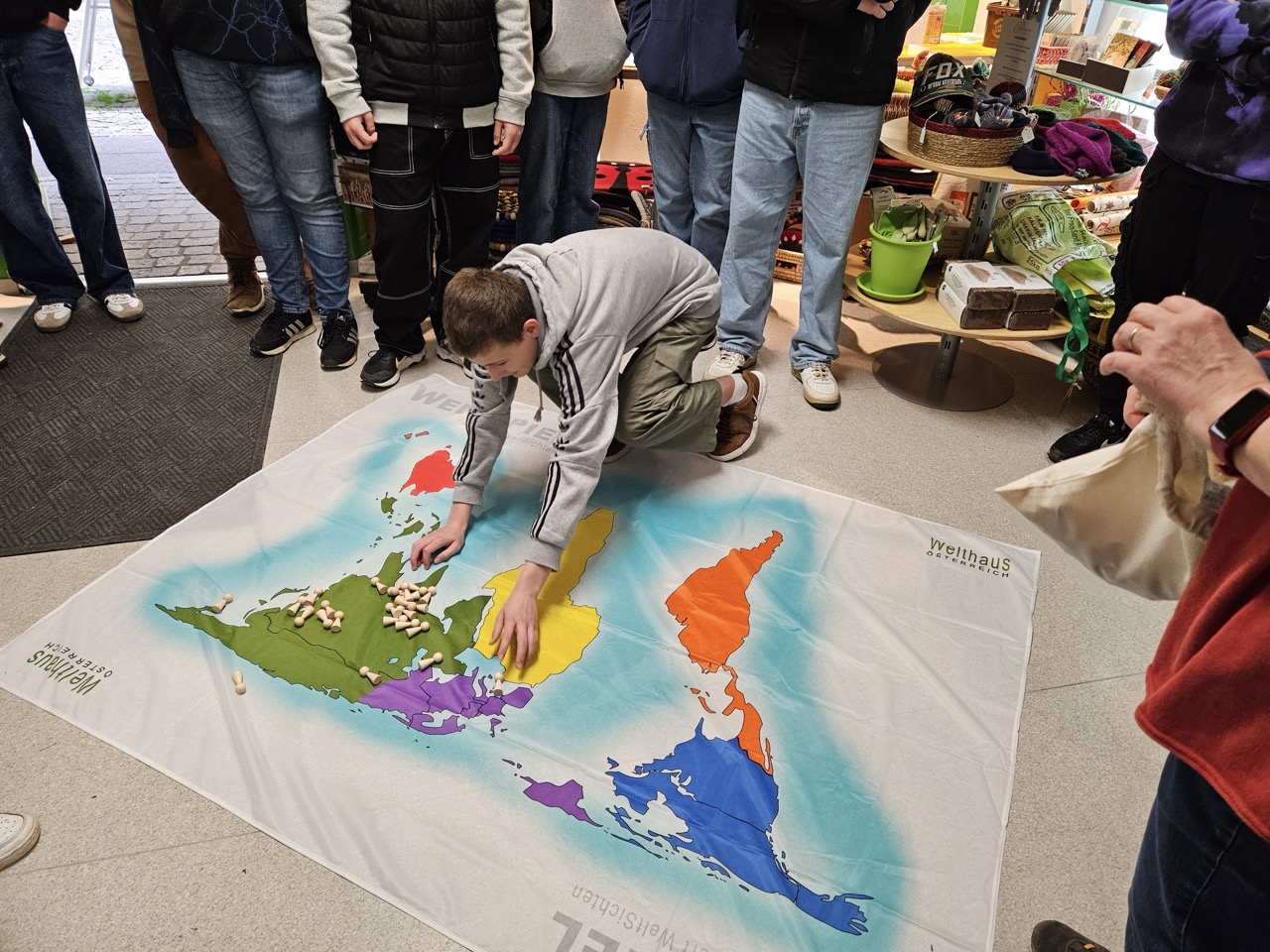 Zu Beginn führte die Bildungs- und Erziehungsbeauftragte, Frau Schurse, ein Weltspiel mit den Schülerinnen und Schülern durch. Die Jugendlichen sollten gemeinsam entscheiden, wie die Weltbevölkerung auf den Kontinenten verteilt ist und diese symbolisch anhand von 100 Spielfiguren auf einer Weltkarte verteilen.