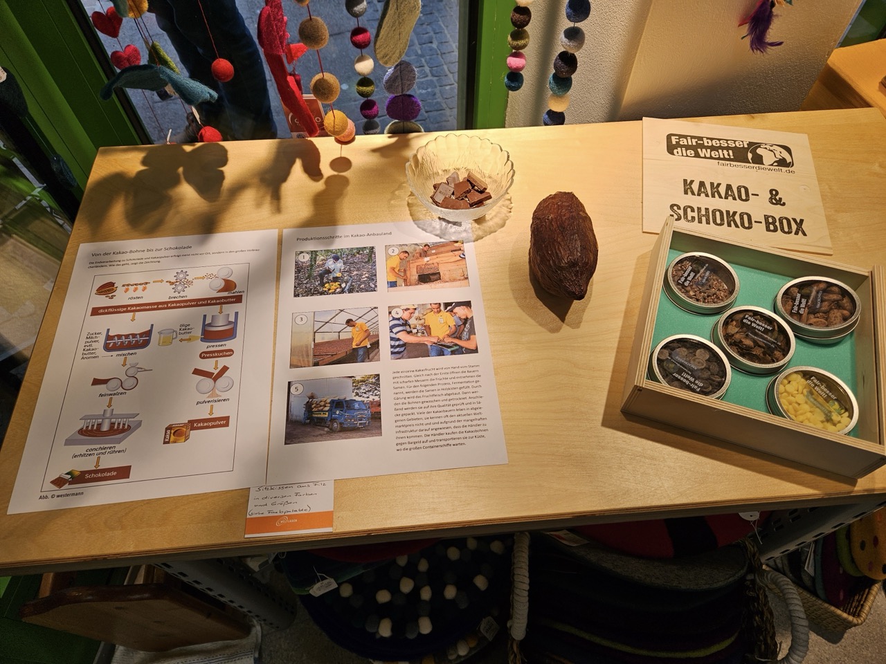 Die Jugendlichen konnten an dieser Station die Produktionsschritte vom Anbau des Kakaos über die Ernte bis zur Produktion herausfinden.
