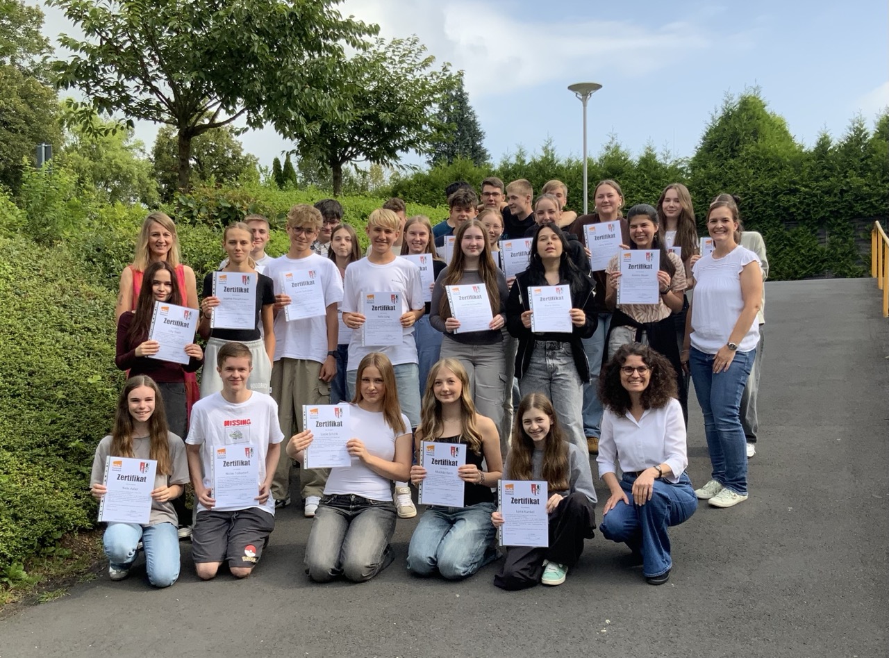 Die 28 Tutoren des sich zum Ende neigenden Schuljahres erhielten zum Dank für ihr geleistetes Engagement von Frau Zlotos und ihren Betreuungslehrkräften Frau Leibl und Frau Müller das wohlverdiente Zertifikat sowie ein kleines Dankeschön.