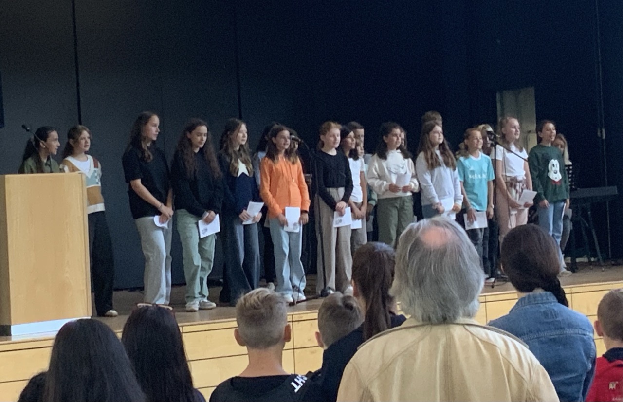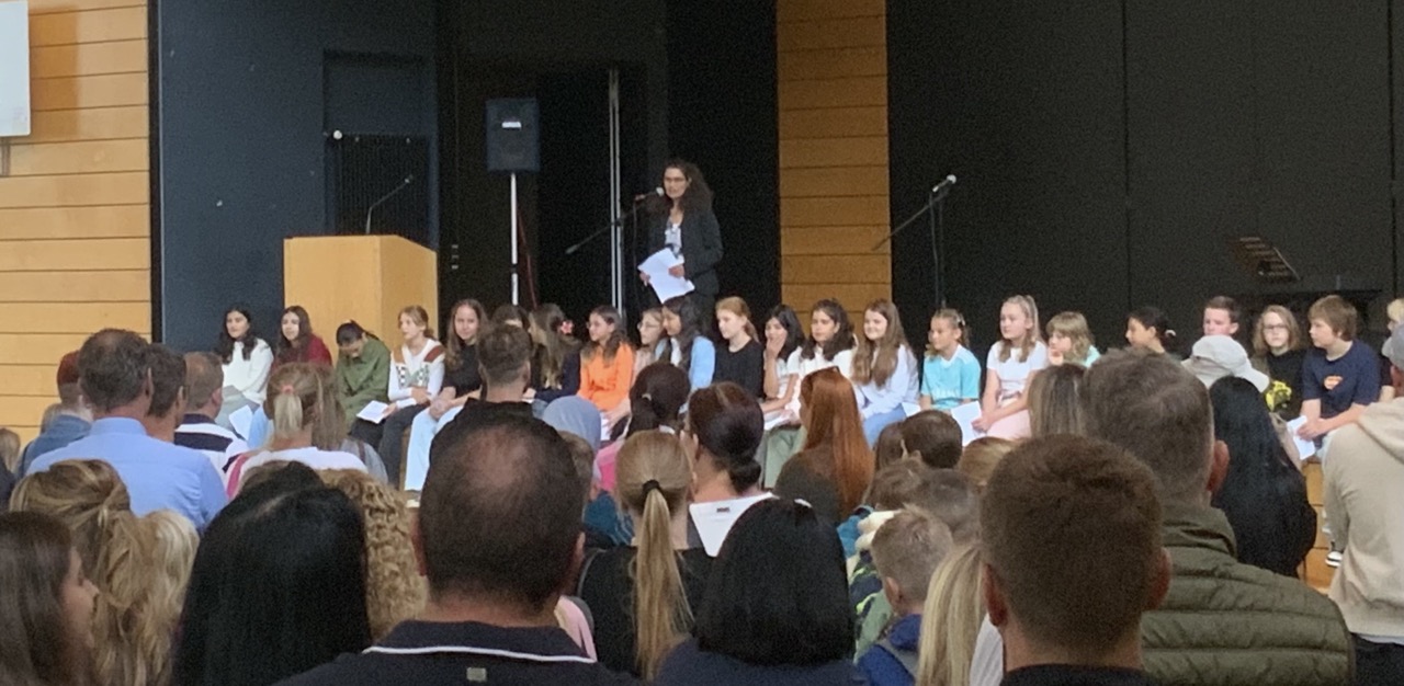 Am Morgen des 10. Septembers war es soweit: An der RSH wurden die Fünftklässlerinnen und Fünftklässler mit ihren Familienangehörigen in der Zweifach-Halle herzlich willkommen geheißen. Dort warteten bereits die Schülerinnen und Schüler der Chorklasse 6c mit ihrer Musiklehrerin Carolin Eck, um mit den Liedern „Ich wollte nie erwachsen sein“ und „Feuerwerk“ die Kinder und deren Eltern stimmgewaltig und freudig zu begrüßen. Auch die Klassenleitungen bzw. Co-Klassenlehrerinnen der Klassen 5a bis 5f sowie die Tutorinnen und Tutoren freuten sich auf ihre „Neuankömmlinge“.