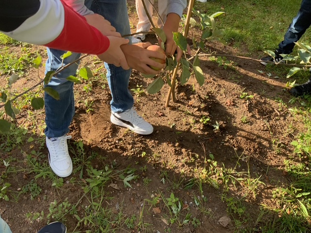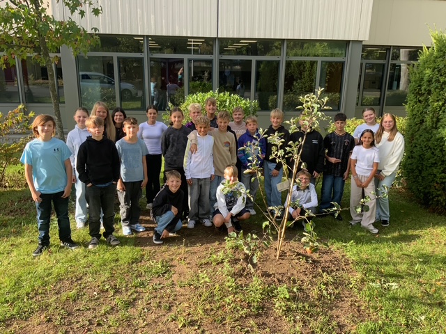 Im Juni wurde von der damaligen Klasse 5d mit ihrer Klassenlehrerin Frau Martin der erste Jahrgangsstufenbaum der fünften Klassen gepflanzt. Nachdem die Klasse vor den Sommerferien mit täglichem Gießen wochenlang für ein gutes Anwachsen des kleinen Bäumchens gesorgt hatte, war in den Sommerferien der erste Apfel gereift. Ein herzliches Dankeschön gilt an dieser Stelle den Damen vom Sekretariat sowie Frau Müller und Frau Zlotos, die sich auch während der Ferien darum gekümmert haben, dass der Baum nicht verdurstet. Am ersten Schultag war es dann endlich soweit: Die Klasse 6d erntete den ersten reifen Apfel vom Jahrgangsstufenbaum. Für die Schülerinnen und Schüler der Klasse 6d war es ein ganz besonderer Moment, der auch entsprechend auf Bildern festgehalten werden musste. Anschließend wurde der Apfel innerhalb der Klassengemeinschaft gerecht aufgeteilt und verkostet. Er war etwas säuerlich, dafür aber sehr saftig - einfach erfrischend gut! Nun ist die Klasse gespannt, wie sich das Jahrgangsstufen-Bäumchen im Laufe dieses Schuljahres weiterentwickelt und gemeinsam mit den Schülerinnen und Schülern über die Jahre wächst und reift. Schon bald wird der nächste Obstbaum seinen Platz auf dem Gelände der RSH finde, für den eine fünfte Klasse die Patenschaft übernehmen wird.