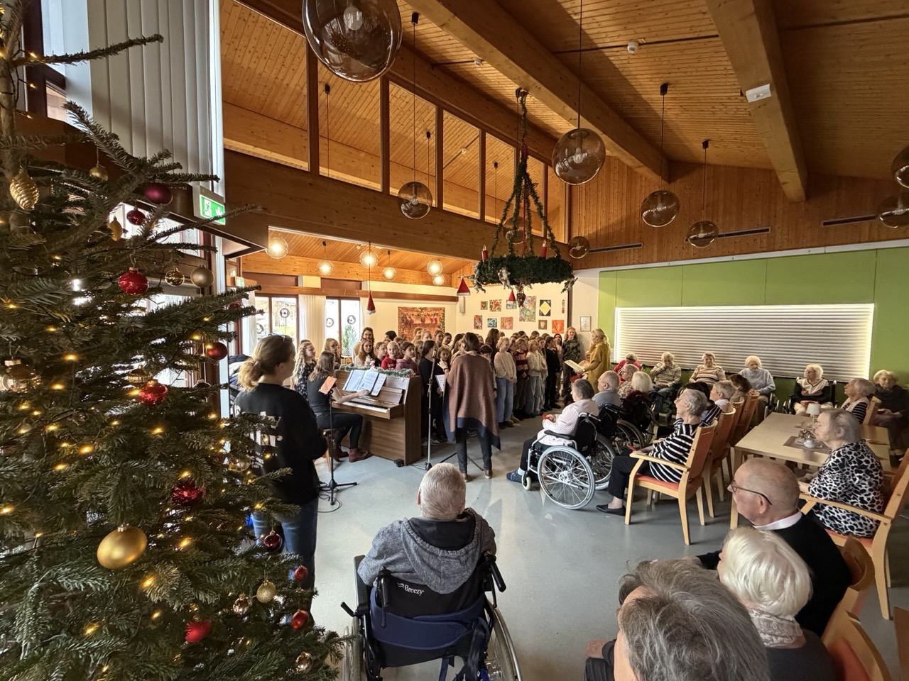 Unter dem diesjährigen Motto „Wie Liebe klingt“ eröffneten die beiden Klassen den Vormittag zunächst gemeinsam mit einem Medley traditioneller Weihnachtslieder, das bei den Senioren sofort Erinnerungen weckte und zum ersten Mitsummen einlud. Den schwungvollen Übergang gestaltete anschließend die Chorklasse 5c mit dem Klassiker „Frosty the Snowman“, bei dem die Begeisterung der Kinder sofort auf das Publikum übersprang.