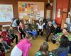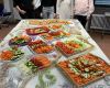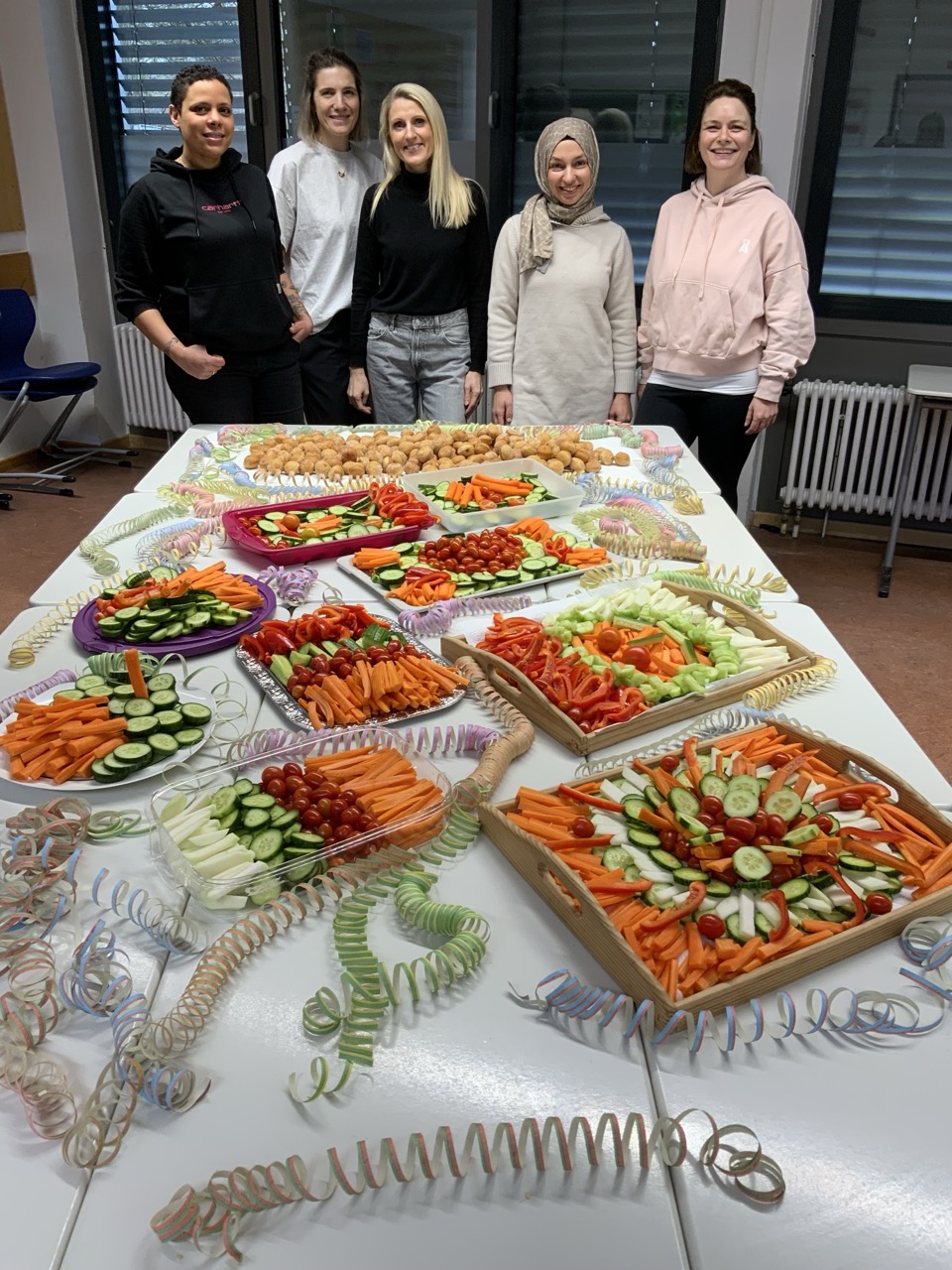 Den Höhepunkt der Feier stellte die ellenlange und lautstarke Polonaise aller sechs fünften Klassen durch und um das Schulhaus dar, die beim gesunden Faschingsbuffet einen Halt einlegte, um jedem Narren und jeder Närrin die Möglichkeit zu geben, sich zum Abschluss zu stärken. Dankenswerterweise hatten Eltern am Vormittag gespendetes Gemüse eifrig geschnitten und es gemeinsam zu einem ansprechenden Faschingsbuffet hergerichtet.