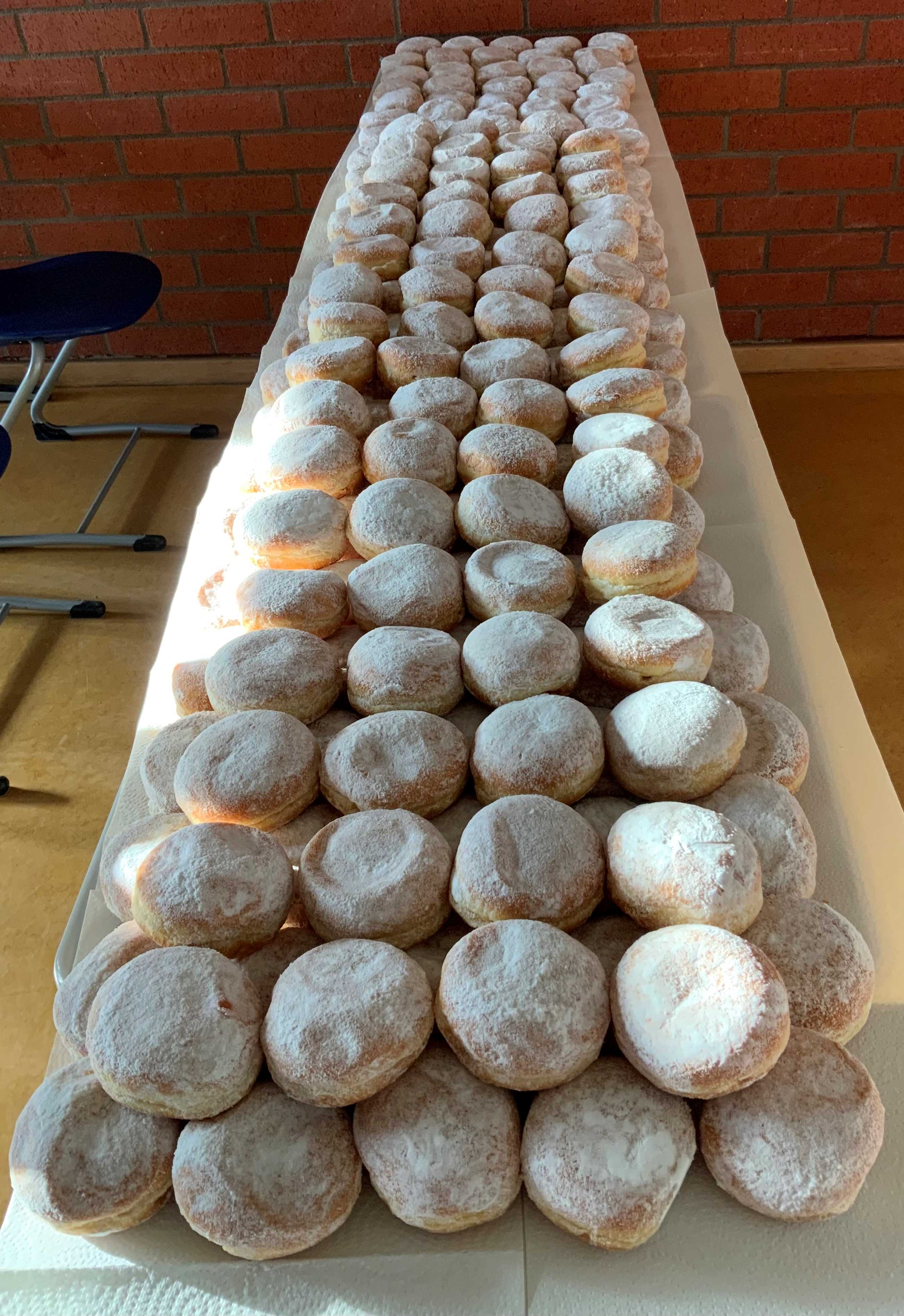 Nach der Durchführung diverser Spiele - die Dank des herrlichen Wetters auch draußen stattfinden konnten - und einigen Tanzeinlagen hatten sich alle Feierwütigen einen leckeren Kreppel zur Stärkung verdient. Vielen Dank an Frau Schäfer von der Firma Priska, die innerhalb kurzer Zeit diese Riesenbestellung ermöglichen konnte.